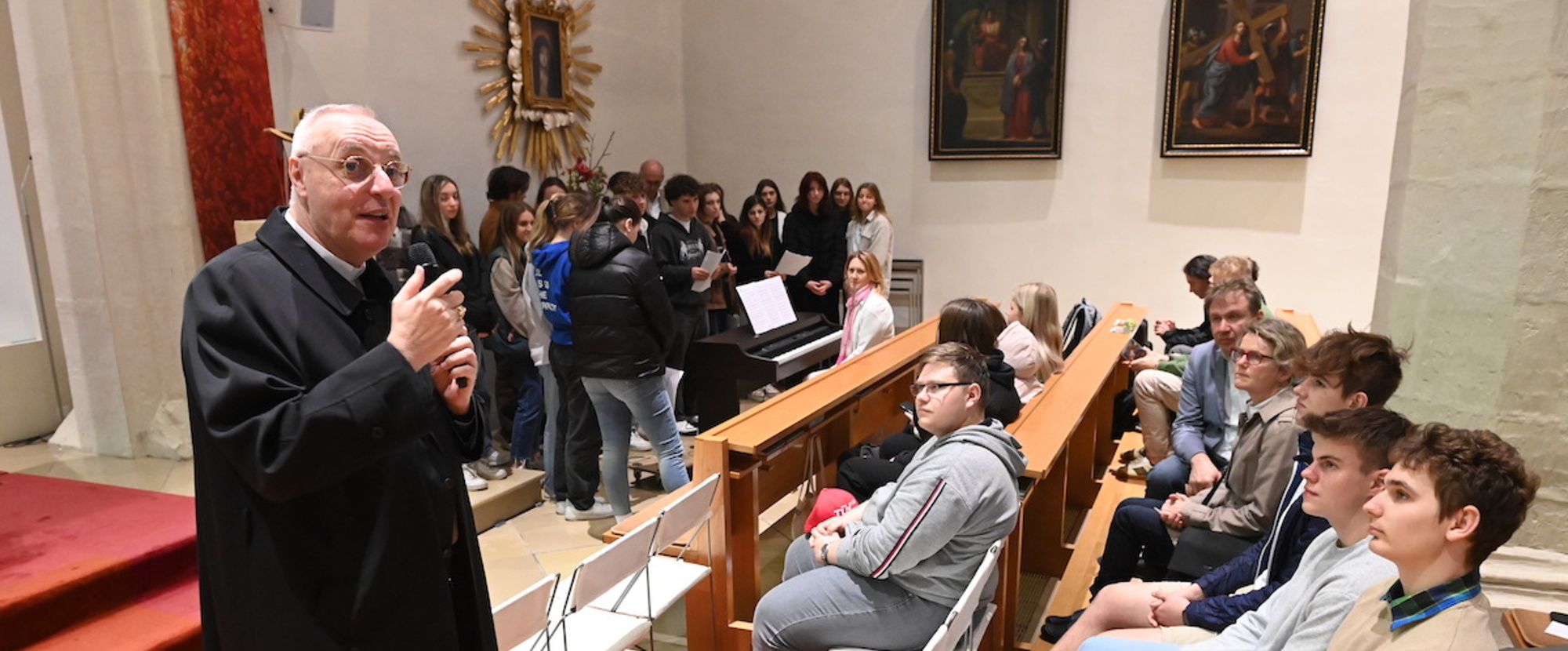 "Junge Menschen auf einen geistlichen Beruf anzusprechen, fällt mir nicht schwer", so Pater Karl Schauer OSB, Bischofsvikar für Berufungspastoral der Diözese Eisenstadt, der die Jugendlichen im Martinsdom empfing. Als Auftaktveranstaltung fand dort die "Spurensuche" im Berufsleben derer, die Theologie studiert haben, statt: Neben einer Theologiestudentin standen ein Priester, Ordensleute sowie eine Religionslehrerin den Schüler:innen Rede und Antwort. Im zweiten Teil ging es für die Schüler:innen, begleitet von ihren Religionslehrer:innen, Kolleg:innen und den eigenen Mitarbeiter:innen auf "Theotour" durch das neue Diözesanhaus und den Bischofshof. Zahlreiche Begegnungsmöglichkeiten mit vielen Arbeitsfeldern in der Diözese wurden möglich.