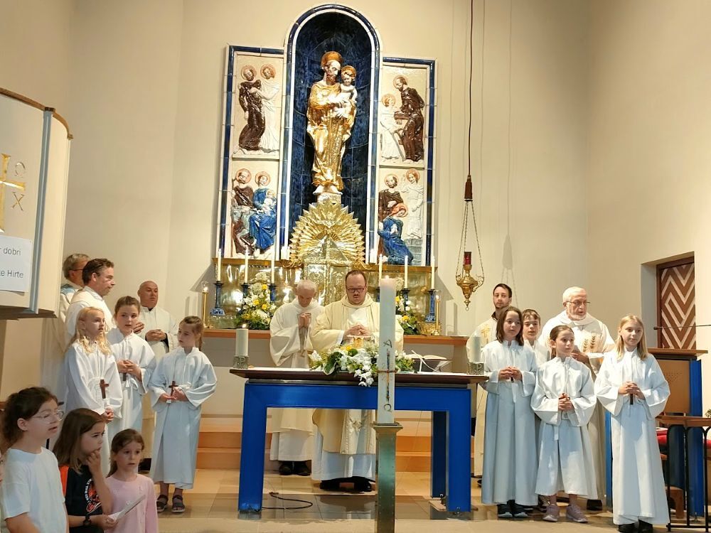 Kinder aus dem ganzen Burgenland kamen zur Schule in Güttenbach, wo sie von ihren Gastgebern erwartet wurden: Lehrerinnen und Lehrer sowie Kinder aus Güttenbach. Die ersten Grußwort sprach der Ortspfarrer, bevor um 10:00 Uhr die Prozession zur Kirche begann. Unterwegs beteten und sangen alle unter der Leitung des örtlichen Pfarrers. Die meisten Schulen reisten mit dem Bus zur Wallfahrt an, doch die Kinder aus Neuberg machten sich zu Fuß auf den Weg. Die heilige Messe zelebrierte der Ortspfarrer David Grandits, in Konzelebration mit kroatischen Priestern aus dem Burgenland. Die Kirche von Güttenbach war bis zum Rand gefüllt.