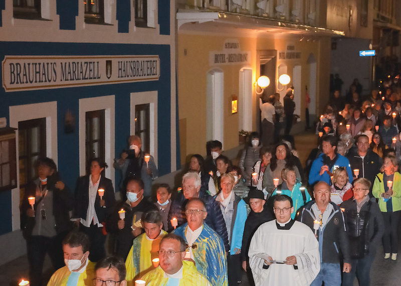 Am Samstagnachmittag wurde um 14:30 Uhr der Kreuzweg auf dem Kalvarienberg in der wunderschönen Landschaft von Mariazell gebetet. Eine schöne Schar von Gläubigen ging den steilen Weg von Station zu Station mit, mit dem was sie persönlich belastet, den je eigenen Sorgen und Schmerzen, die sie dem leidenden Jesus empfahlen. Eine kurze Betrachtung hielt auf dem Kalvarienberg Diakon Mag. Marinko Kelava. Ein kleines Zeichen, dass Gott voll Güte auf sein Volk schaut, war auch das Wetter: als der Kreuzweg zu Ende war, fing es an zu regnen - ebenso am Abend als die Lichterprozession beendet war.