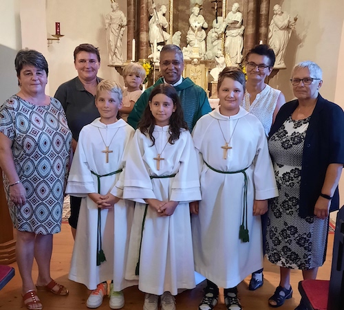 Foto von links: Maria Lapatschek, Bernadette und Emma Gsertz, Pfarrer Dr. Thomas Vayalunkal, Hermine Trobollovich und Theresia Breitfellner und Ministrantin/en Elias Giefing, Valentina Weber und Tobias Giefing.