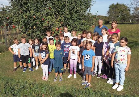 So besuchte man im Rahmen eines Lehrausganges im Sachunterricht nun die Familie von Silvia und Karl Kührer, die den Neuberger Dorfladen betreiben. In ihrem Garten konnten die Kinder nun selbst Äpfel pflücken. Dabei wurden die verschiedensten Sinne der Kinder angesprochen, konnten sie doch bei der Tätigkeit Dinge beobachten, entdecken, fühlen, riechen, schmecken und natürlich auch sich bewegen. Je mehr Sinne beim Lernen angesprochen werden, umso mehr merkt man sich. Ein weiteres Ziel war und ist es auch, ein Bewusstsein für Nachhaltigkeit und Regionalität zu entwickeln. Aus diesen von den Kindern selbst gepflückten Äpfeln sowie auch jenen Äpfeln, die von den Eltern bereit gestellt wurden, wird nun ein Apfelsaft am Bio-Hof von Bianca und Marcel Pomper gepresst. In Flaschen gefüllt und mit von Kindern selbst angefertigten Etiketten verziert wird dieser Saft dann nach dem Erntedankfest am 1. Oktober 2023 der Bevölkerung von Neuberg präsentiert.