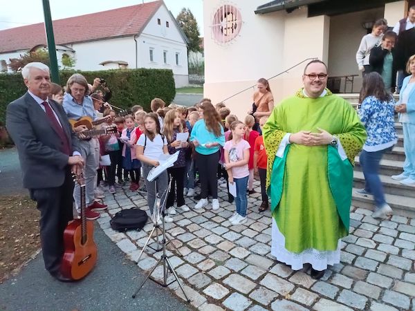 Dieser Einladung folgten nicht nur die Menschen aus den beiden oben genannten Pfarren, sondern auch viele Menschen aus seinen bisherigen Pfarren, seiner Heimatgemeinde Hackerberg und seiner Heimatpfarre Stinatz. Aber auch zahlreiche Priesterkollegen erwiesen dem Jubilar die Ehre und waren als Mitzelebranten bei der Messe dabei. Unter der Leitung von Heiko Reiter an der Orgel erfolgte die musikalische Umrahmung der Dankesmesse durch den Männerchor aus Güttenbach. Aber auch die Volksschulkinder aus Güttenbach und Neuberg brachten während der Messe drei Lieder dar. Am Ende des Gottesdienstes gratulierten die Ministranten aus Güttenbach, die Volksschulkinder aus Neuberg, wo Pfarrer Grandits auch als Religionslehrer unterrichtet, und Direktor Oberschulrat Karl Knor dem beliebten Jubilar. Nach dem feierlichen Auszug aus der Kirche sangen dann die Kinder aus Güttenbach und Neuberg nochmals dem Geburtstagskind ein Lied und Lehrer Dominik Tallian gratulierte für die Volksschule Güttenbach.
