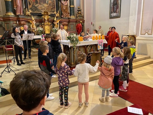 Seit September dieses Jahres gibt es in Trausdorf einen Liturgiekreis für Kinder, der einmal im Monat eine Familienmesse mit rhythmischen, zweisprachigen Liedern und Texten für Kinder vorbereitet. Kinder nehmen aktiv an der hl. Messe teil – sei es mit Tanz, einer Geschichte oder einem kleinen Theaterstück. Lebendiger Glaube wird durch diese neue Initiative sichtbar und bereitet vielen Gläubigen Freude.