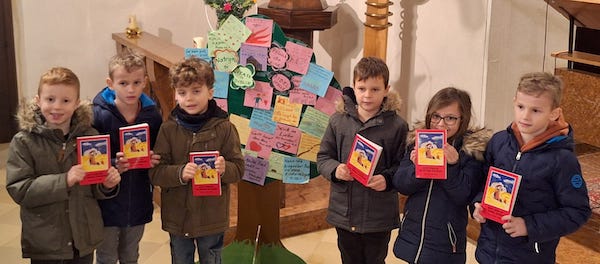 Die Erstkommunionkinder der Gemeinde Weiden b. R. erhielten am Samstag, den 27. Januar, im Rahmen der heiligen Messe ihre Bibel als Geschenk. Für alle Anwesenden, die mitfeierten, bastelten die Mädchen einen Baum mit Bibelzitaten auf Kroatisch und Deutsch zum „Pflücken“ und Mitnehmen. Alle Anwesenden nahmen das Angebot freudig an und der Baum wurde „abgeerntet“.