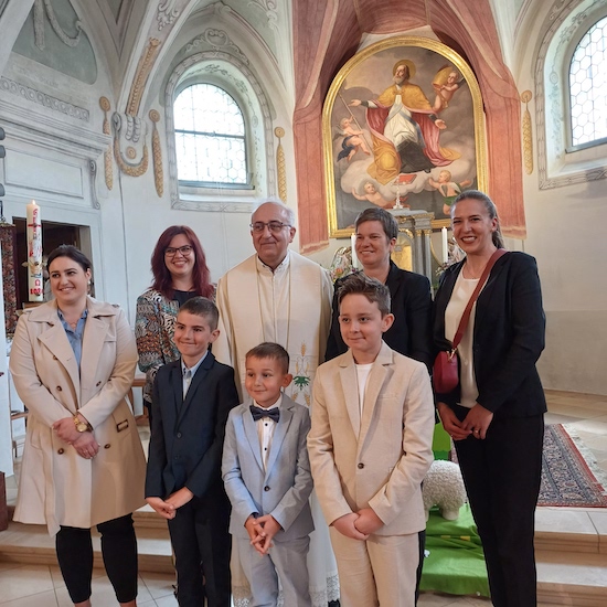 Am Fest der Heiligen Dreifaltigkeit fand in unserem Dorf die Erstkommunion statt. Um zehn Uhr ging es in Prozession zur Kirche. Die hl. Messe mit der hl. Kommunion feierte Pfarrer MMag. Franz Borenitsch. Auf der Orgel spielte Kantor Mag. Martin Miletits. Schulleiterin Ana Zvonarits und die Lehrerinnen Klaudia Sankovich, Silvia Gangl, Laura Gruber, Nina Martinkovits und Kristina Egger bereiteten die Kinder auf diesen großen Tag vor. Die Kinder der Volksschule unterstützten die Erstkommunikanten mit ihren Liedern und die Lehrerin Klaudia Sankovits begleitete die Kinder auf der Gitarre.
