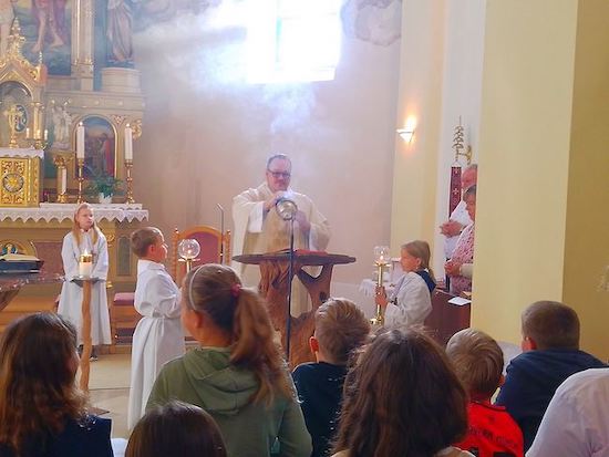 Ortspfarrer Mag. David Grandits erklärte ihnen, warum wir diesen Tag feiern und was Kirche bedeutet. Wie die Pfarrkirche aus vielen kleinen Ziegelsteinen erbaut ist, so entsteht in der Kirche aus ihren vielen Gläubigen Teil für Teil ein gemeinsames Ganzes. Die Kirche ist nicht nur ein Gebäude, sondern Kirche bedeutet „Gemeinschaft“ und „Zugehörigkeit zu Gott“.