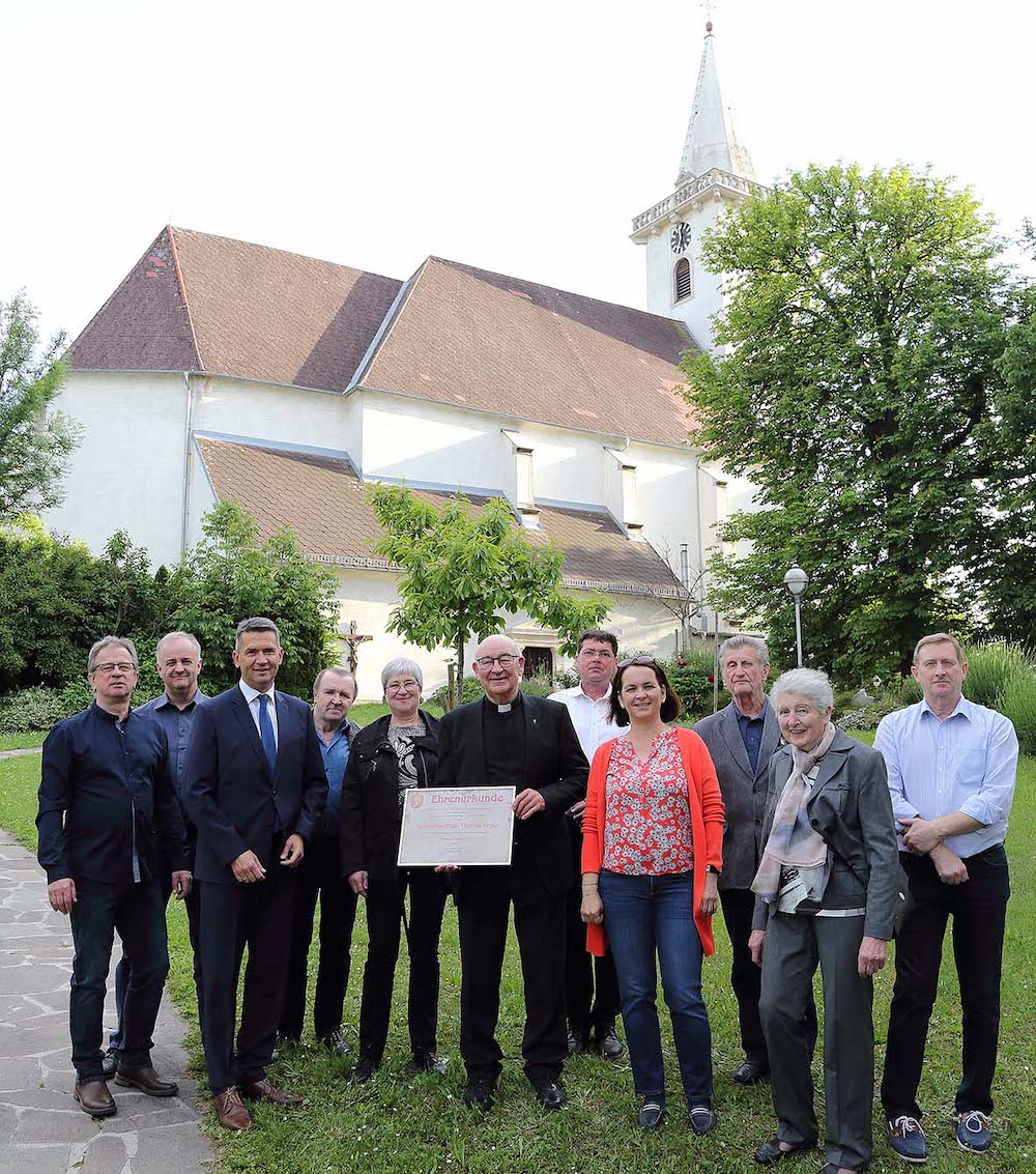 Die hohe Auszeichnung überreichte Bürgermeister Rainer Porits und Mitglieder des Gemeinderates an Kan. Krojer im Rahmen eines kleinen Festaktes am Mittwoch, den 2. Juni im Pfarrgarten - zwischen Pfarrhof und Kirche, wo er 15 Jahre als Pfarrer wirkte. Beim Festakt waren auch der jetzige Pfarrer Mag. Stefan Raimann und Mitglieder des Pfarrgemeinderates anwesend.
