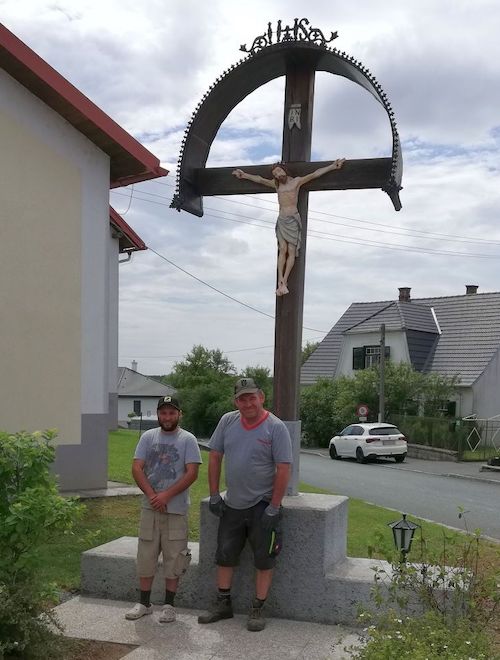 Sie stutzten bzw. entfernten die Sträucher, die teilweise bereits in die Fahrbahn in der Florianigasse hingen. Sie säuberten das Kreuz und erneuerten auch die Pflasterung vor dem Kreuz, so dass man wieder ungehindert dem Kreuz näher treten kann. Ein neuer Anstrich noch und dann strahlt das Kreuz mit dem neu gestalteten Platz wieder.