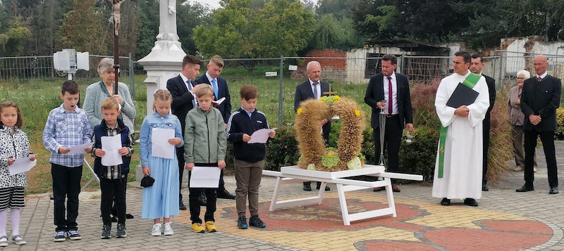 Am letzten Sonntag im September feierten wir das diesjährige Erntedankfest. Die Feier begann beim Kreuz im oberen Ortsteil. Zuerst segnete Diakon Michael Marlovits die Erntekrone, die anschließend in Prozession von vier Landwirten und begleitet von den Gläubigen in die Kirche getragen wurde.