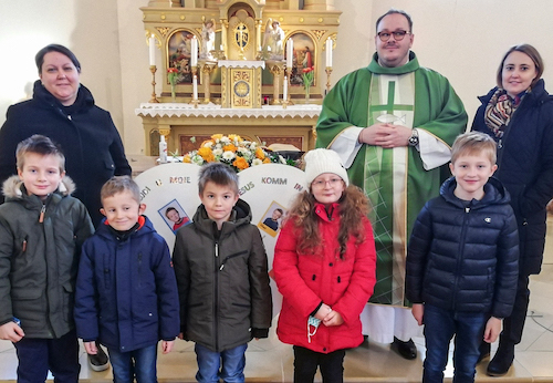 Am Ende der Messe teilten die Kinder Kärtchen aus, mit der Bitte für sie zu beten. Die Erstkommunion findet am Sonntag, den 15.Mai 2022 statt und steht unter dem Motto „Jesus, komm in mein Herz! – Jezuš, dojdi u moje srce!“