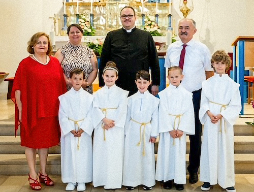 Felix, Anna, Jan, Nico und Milo (am Foto v.l.) empfingen zum ersten Mal das Sakrament der Hl. Kommunion von Ortspfarrer David Grandits.