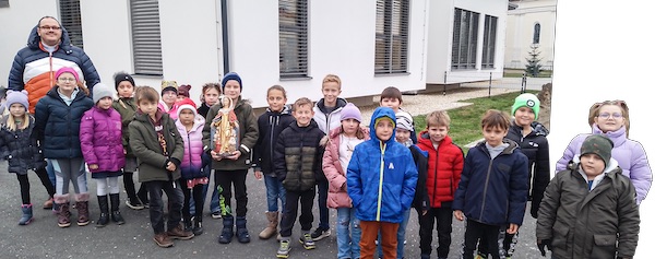 Am 1. Adventsonntag verweilte die Statue in der Kirche. Im Schaukasten hängt eine Liste, in der sich die Menschen eintragen können, die gerne die Marienstatue einen Tag bei sich zu Hause hätten und ihr Herberge geben. Dort können die Familien und deren Freunde auch zu einem gemeinsamen Gebet zusammenkommen. Den zweiten Tag verweilte die Statue in der Volksschule. Am dritten Tage des Advents wurde die Statue von den Volksschulkindern in Begleitung des Herrn Pfarrer Mag. David Grandits und den LehrerInnen zu Frau Emma Kovacs ins Haus gebracht. So soll die Statue in den nächsten Tagen von Haus zu Haus wandern und am Heiligen Abend wieder in die Pfarrkirche zurückkehren.