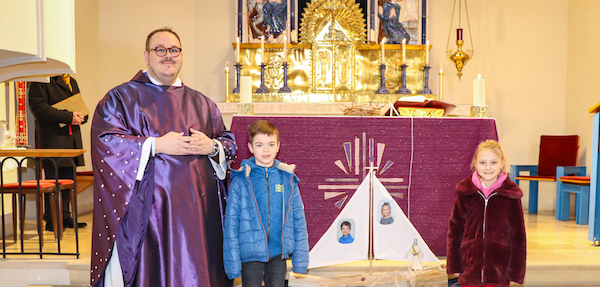 Na sliki je farnik mag. David A. Grandić ter Fabio i Johana.