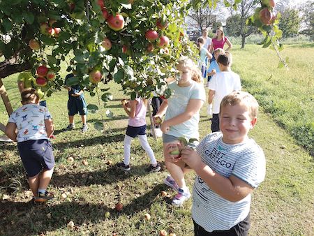 Priroda je tako raznolika i najbolja inspiracija, ar dici nudi širok izbor mogućnosti za igru i učenje, ke zadovoljavaju dičinju potribnost za otkrivanje. Ovde se najdu mnogi poticaji, ki razvijaju kreativnost. U sklopu edukativne ekskurzije pohodila su dica obitelj Silvije i Karla Kührera, ki imaju seosku trgovinu. Dica su sada mogla sama brati jabuke na vrtu. Obradjivana su različna ćutila dice, ar su tokom aktivnosti mogla premišljavati, otkrivati, ćutiti, dušati, kušati i naravno gibati stvari. Čim već ćutil se prilikom učenja aktivira, tim već si dica zapamtu. Drugi cilj je bio, razviti svist o održivosti i regionalnosti. Od ovih jabukov, ke su dica sama nabrala, kot i onih, ke su dali roditelji, će se sada prešiti jabukov sok na bio-seljačkom dvoru Biance i Marcela Pompera. Napunjen u floše i ukrašen etiketami, ke su napravila dica, ov sok će biti pred- stavljen stanovnikom Nove Gore pri žetvenoj zahvali 1. oktobra 2023. Na kraju posebno hvala obitelji Kührer, ka je po branju jabukov dici priredila južinu s jilom i jabukovim sokom.