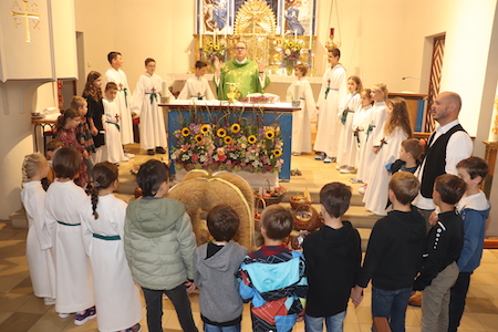 Dica osnovne škole, učitelj Martin Omischl, ministranti i farnik David Grandits kod molitve okolo žetvene korune kod oltara