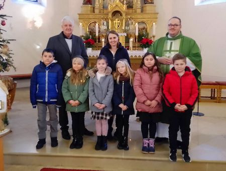 Uključili su se u “Kyrie”, osobno se predstavili, objasnili svoje prvopričesničko geslo “Ti si trs, mi smo rozgve”, pročitali obećanje i otpjevali dvi pjesme. Prekrasna je bila ova maša, pri koj su dica s veseljem nastupila i svojimi teksti i pjesmom ganula srca naroda. Na kraju maše podiljene su kartice s molitvom, ku neka nazočni molu za prvopričesnike ter nje pratu na putu do slavlja prvoga pričešćanja 28. aprila.