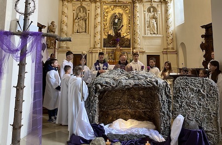 Tu simboliku križa s grobom, uza koga su svi vjerniki na Macicnu nedilju mimo prošli, je umjetnički udjelao i prikazao vjeroučitelj Ivo Šeparović u našoj franjevačkoj crikvi. Pri sv. maši čitala se je Muka Kristuševa po uloga, glavni celebrant pri maši je bio farnik p. Božidar Blažević OFM, a koncelebrant p. Stjepan Lukašević OFM. Bilo je tužno slušati, kako se je jedna masa, ka je klicala za Jezušem, hitro prominila u ljude, ki želju okrutnu smrt Jezuševu. Ipak ta smrt nije bila slučajna i je zapravo vrhunac Božje ljubavi prema njegovomu Sinu i človičanstvu. Obatreni tom božanskom porukom spasenja, su se vjerniki sa svojimi macicami vratili domom, svojoj obitelji i životnomu djelatniku.