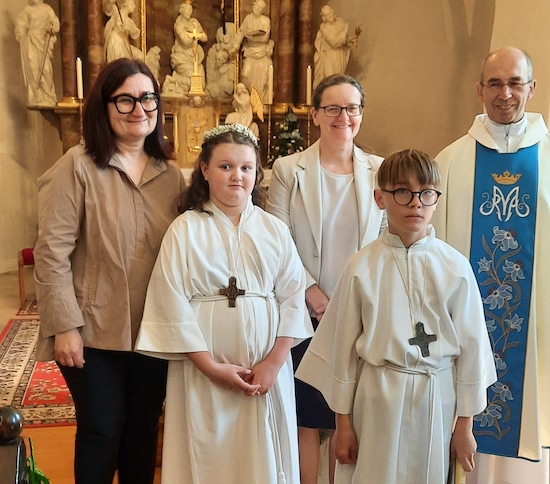 Na sliki su od liva: direktorica osnovne škole mag. Elvira Heisinger, Paula Werković, učiteljica Marija Zvonarić-Karall, Jona Gsertz i farnik mag. lic. Grzegorz Kotynia.