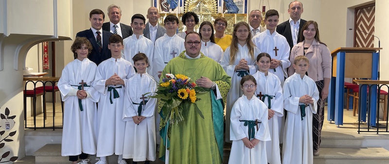 Na sliki su farnik David Grandić s farskim savjetom, načelnikom i nekoliko miništrantov u Pinkovcu.