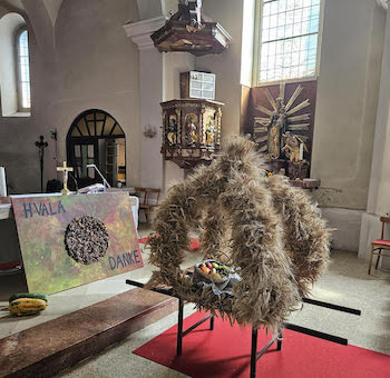 Na žetvenu zahvalnicu su zahvalnost i molitva u fokusu. Tako kanimo sada još nadalje hvaliti. A to našemu dugoljetnomu vlč. farniku Stipi Mlikotiću ki je već pred deset ljet 2024. ljet prošao najpr k našemu Bogu.