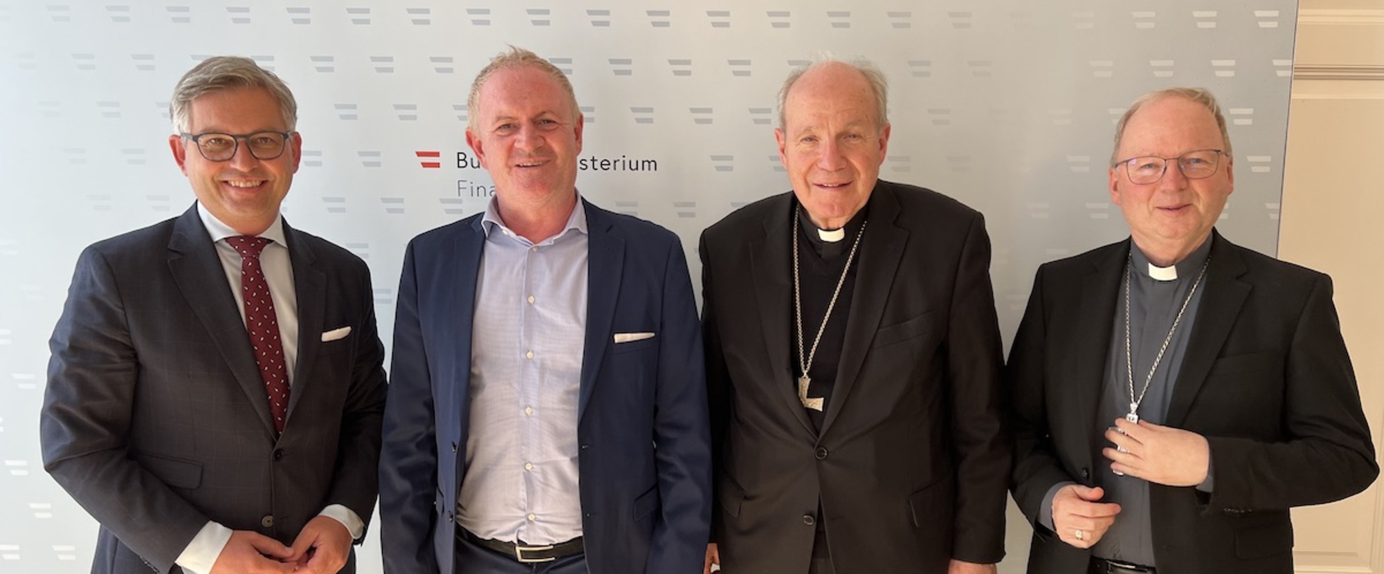 Na sliki o ovom “high level meetingu” su od liva na desno: dr. Magnus Brunner, LL.M. (savezni ministar za financije), Johannes Stipšić MBA (Gospodarski generalni direktor Željezanske biškupije), kardinal dr. Christoph Schönborn (bečanski nadbiškup), dr. Benno Elbs (biškup u Feldkirchu).