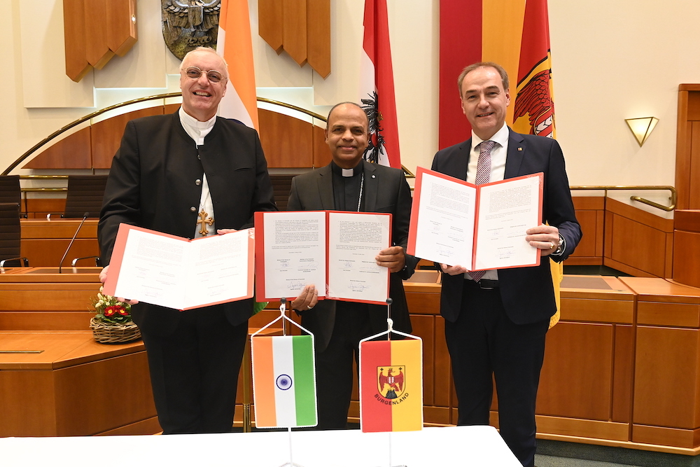 Zemlja Gradišće, Željezanska biškupija i nje indijska partnerska biškupija Kanjirapally jur dugo dobro suradjuju. To je peljalo do ideje o udruživanju snag na području skrbi i podvaranja. Zemaljski savjetnik Leonhard Schneemann, biškup indijske biškupije Kanjirapally Jose Pulickal i željezanski dijecezanski biškup Egidije Živković su srijedu potpisali zajedničku izjavu o namjera u vladi u Željeznu. „Gradišće se je u poslidnji ljeti pozicioniralo kot svitionik na području skrbi i podvaranja u Austriji. Medjutim nas demografski razvitak i potriboća za skrb i podvaranje, ka iz toga proizlazi, postavljaju pred veliku zadaću. Polag prognozov se do 2030. očekuje dodatna potriboća za oko 1.750 medicinskih sestar, prem intenzivnih aktivnosti obrazovanja u samom Gradišću. Naši dosadašnji napori u obrazovanju, koliko god bi oni važni bili, sami nećedu biti dovoljni, da zadovolju ovu potriboću. Zato moramo proširiti perspektivu i pronajti nova rješenja. Jedan od tih pristupov je medjunarodna suradnja u zapošljavanju kvalificiranoga medicinskoga osoblja“, istaknuo je zemaljski savjetnik Schneemann prilikom potpisivanja.