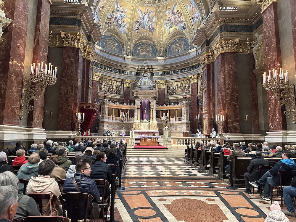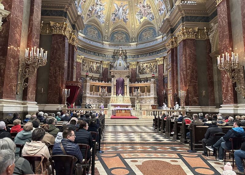 Prva točka ovoga protulićnoga dana je bila bazilika sv. Štefana, ka je najpoznatija i more bit i najimpozantnija bazilika Madjarske, kade su imali Hrvati iz tri zemalj svetu mašu na hrvatskom jeziku, ku je služio vlč. Branko Kornfeind u koncelebraciji nardarskoga farnika vlč. Balázsa Boke i farnika Zdravka Gašparića. Svetu mašu su muzički oblikovali tamburaši iz Čembe. Bila je to zmožna grupa, čuda vjernikov, ke je povezalo hrvatstvo, skupni materinski jezik, vjera i kulturno jerbinstvo. Hrvatske jačke su prelipo glušale u velikoj baziliki glavnoga grada Madjarske. Na svetoj maši je bio nazoči i veleposlanik Republike Hrvatske u Budimpešti, gospodin dr. sc. Mladen Andrlić, ter njegovi suradniki. Gospodin veleposlanik je poslije mašnoga slavlja primio na razgovor predstavnike tri mjesta: Čembe, Narde i Murskoga Središća.
