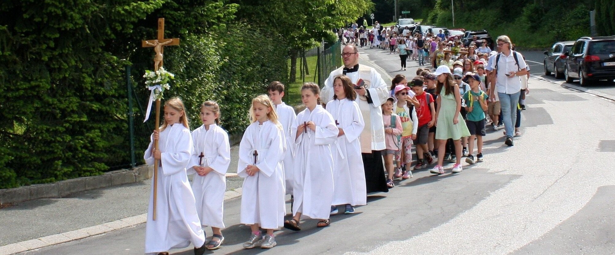 Dica iz cijeloga Gradišća su došla do škole u Pinkovcu, kade su ih čekali domaćini: učitelji i dica iz Pinkovca. Prve podravne riči je rekao domaći farnik a potom, u 10.00 uri se je ganuo ophod do crikve . Na putu su svi skupa molili i jačili pod peljanjem domaćega farnika. Škole su većinom na busi došli na shodišće, ali dica iz Nove gore su se piše otpravila na put. Svetačnu svetu mašu je služio domaći farnik David Grandić u koncelebraciji hrvatskih farnikov iz Gradišća. Pinkovačka crikva je bila do zadnjega mjesta puna. Lipo je bilo čuti kako dičji glas napuni crikvu i kako oduševljeno mali jaču pjesme, ke su se na vjeronauku naučila. Na početku svete maše je pozdravila stručna savjetnica Katja Marth sve nazočne a potom je direktorica Hrvatskoga vikarijata, dr. Kristina Glavanić pozdravila sve nazočne i prenjela najlipše pozdrave željezanskoga biškupa Egidije Živkovića.