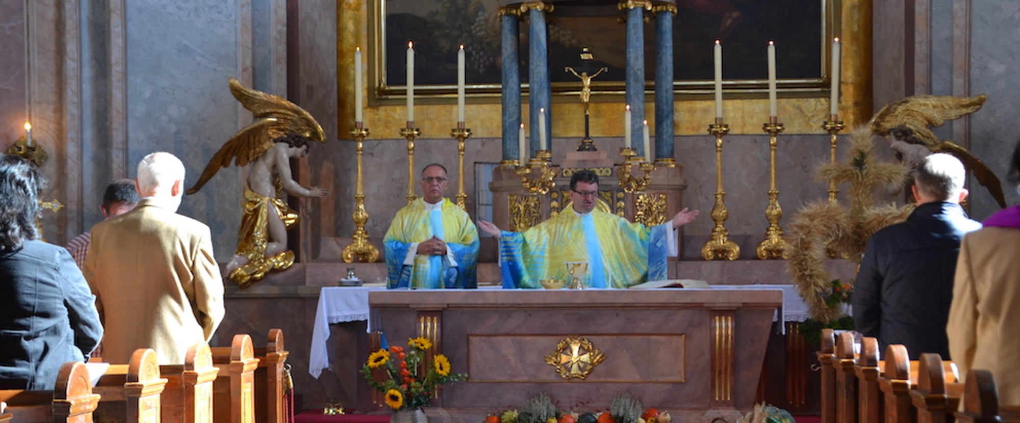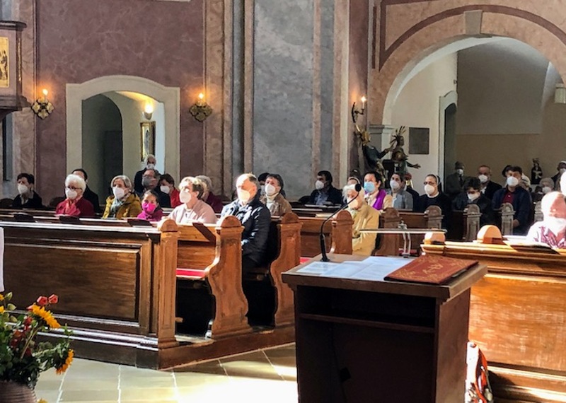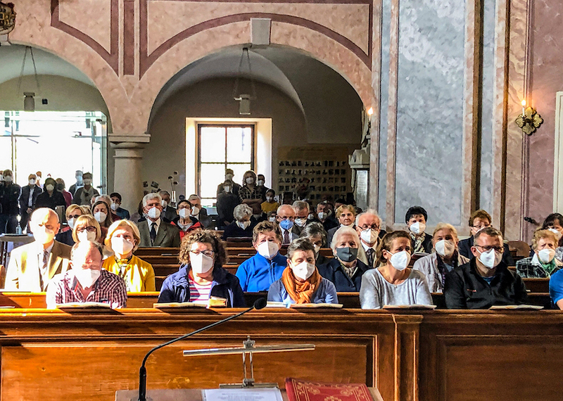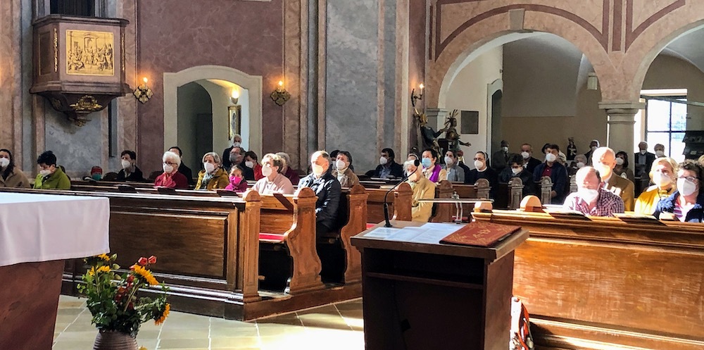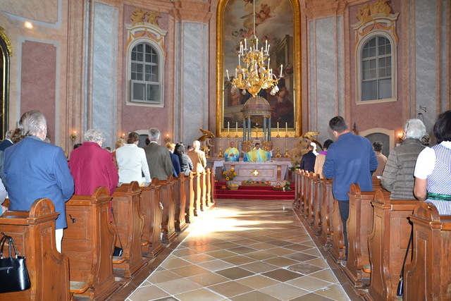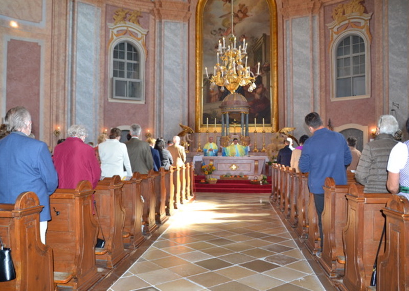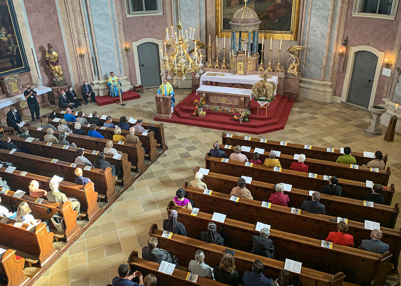 Svetačnu svetu mašu u 10.00 ura predvodio je srebrnomašnik Joško Kuzmić. Njega i sve hodočasnike pozdravio je biškupski vikar kan. mag. Željko Odobašić na početku sv. maše kot ravnatelj i skupnih hrvatskih shodišćev. Pokazao je na aktualnu situaciju i kako korona-pandemija odredjuje žitak. Iz vlašćega iskustva on zna za ozbiljnost i težinu betega COVID 19, ka sa sobom nosi uz tjelovne boli i duševni strah za žitak. Na koroni boluje u prošli dvi tajedni i željezanski biškup dr. Egidije Živković, ki je željio slaviti ovo shodišće s Gradišćanskimi Hrvati u Željeznu. Zato je biškupski vikar kan. Odobašić prenosio pozdrav biškupa i prosio hodočasnike, moliti za natpastira, kako i on moli za vjernike - a u oktobru posebno i očenaše.
