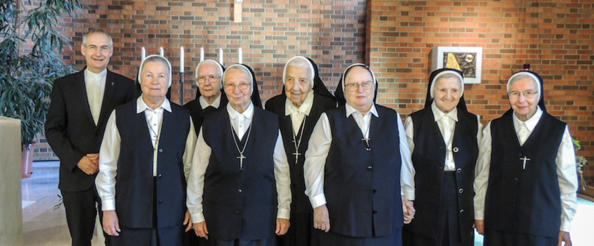 Na sliki su od liva na desno: generalni vikar kan. mag. Michael Wüger, provincijalna poglavarica sr. Consolata, sr. Evelina, sr. Jacinta, sr. Marcellindis, generalna poglavarica sr. Johanna, sr. Emerentia, sr. Maria D. ter kako generalni vikar predaje jubilarkam dar biškupa.