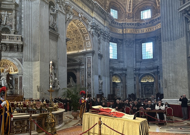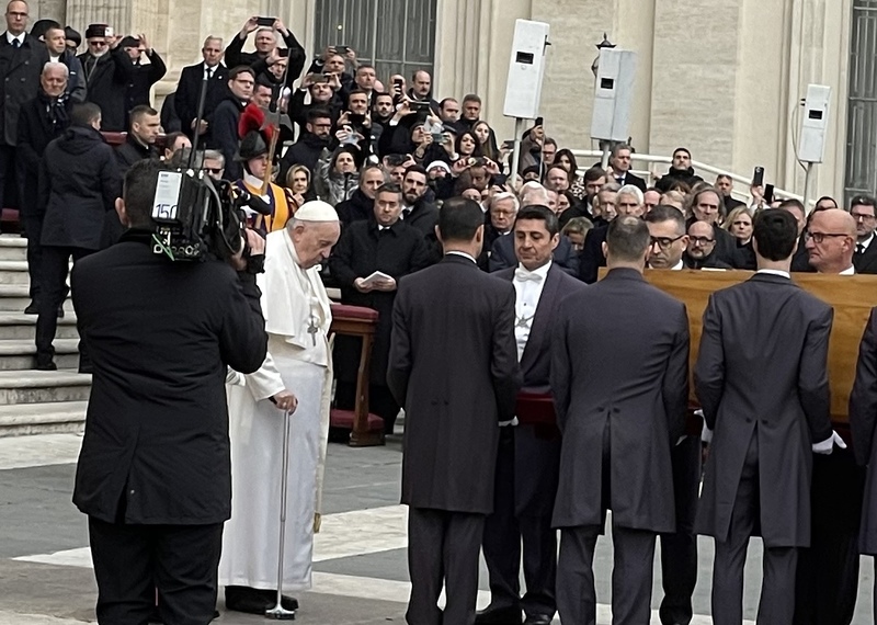 Papst Franziskus (m.l.) vor dem Sarg von Papst Benedikt XVI., am 5. Januar 2023, während der Trauermesse für den emeritierten Papst Benedikt XVI. auf dem Petersplatz im Vatikan.