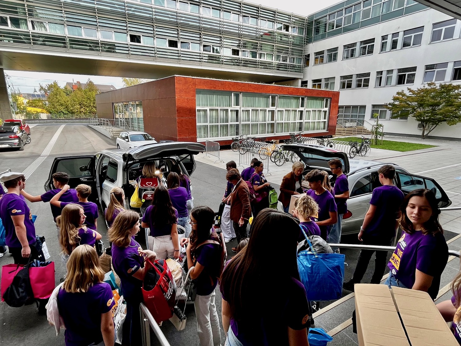 18 Schülerinnen und Schüler der 1CW der HLW Neusiedl am See sammelten unter der Regie von Gruppenleiterin Claudia Peter und Projektbetreuer André Thaler gebrauchte und neuwertige Schultaschen und Schulrücksäcken für Kinder, die sich keine eigenen leisten können.