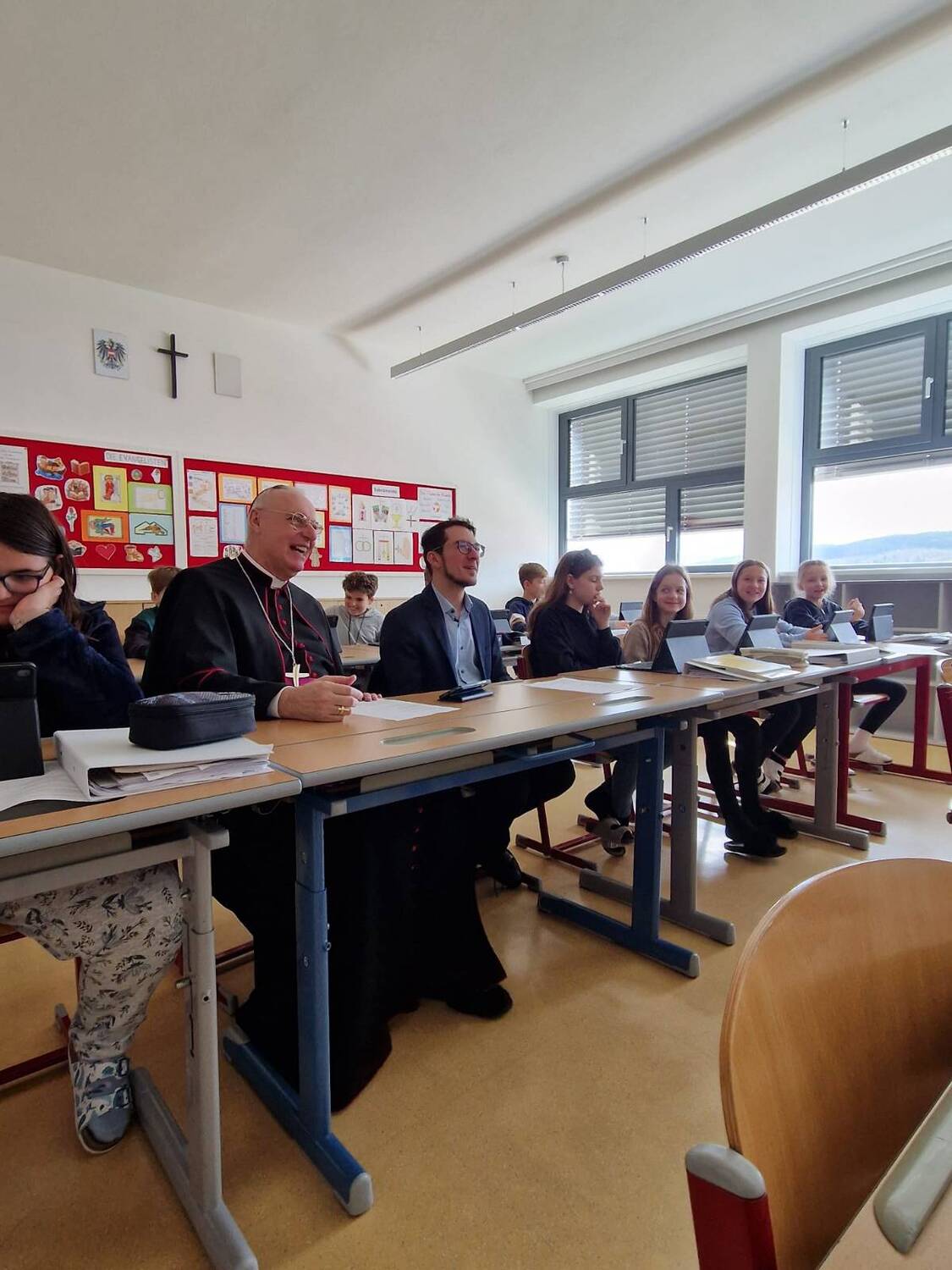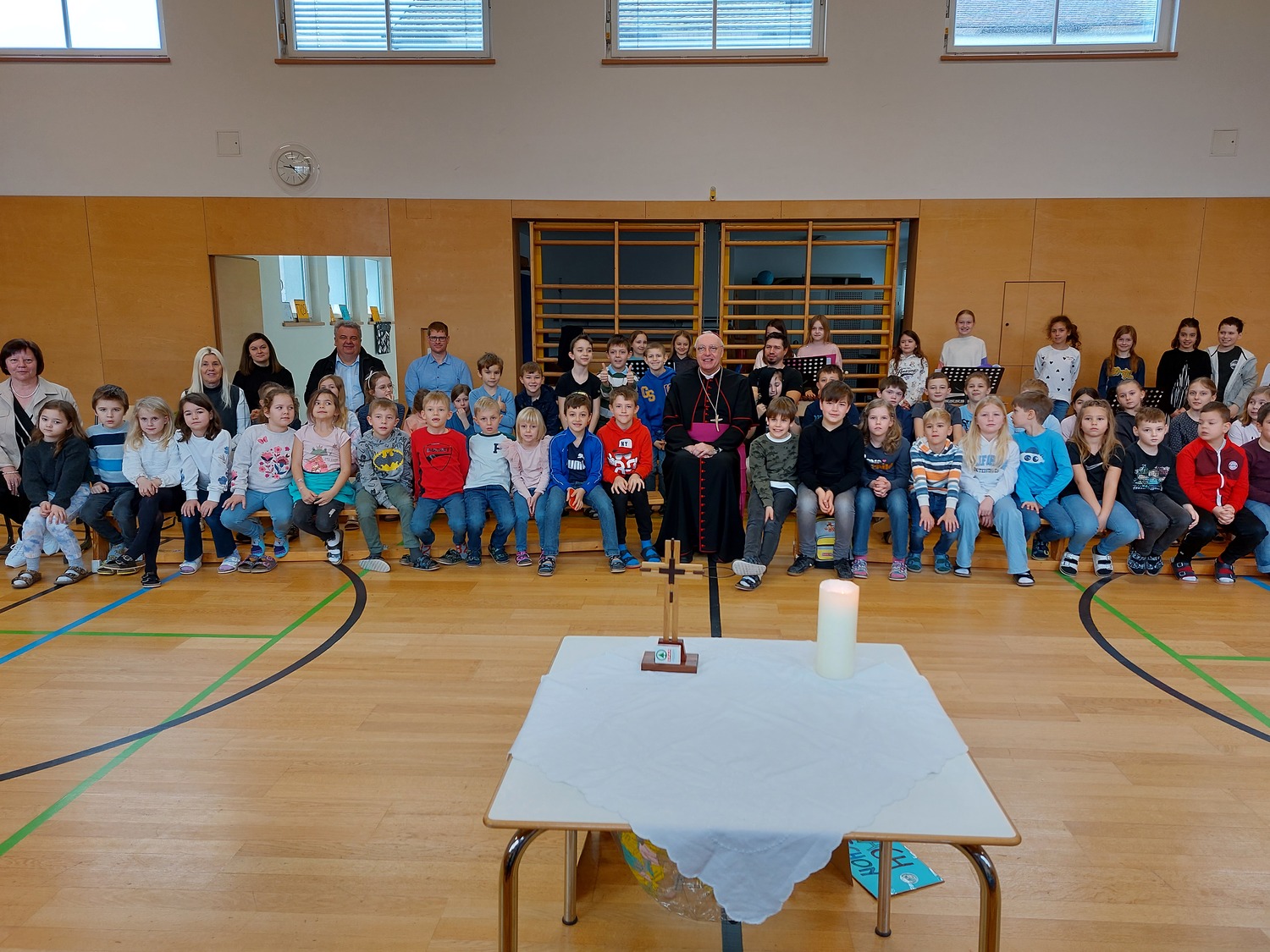 Weiter ging der Vormittag an der Mittelschule Kobersdorf. "Der Herr ist mein Hirte" war hier der Leitsatz der ökumenischen Wort-Gottes-Feier, an der auch Kinder und Lehrpersonen der örtlichen Volksschule und Pfarrmoderator Shinto Varghese Michael teilnahmen. Im folgenden Besuch in der ersten und zweiten Klasse wurde gerappt, ein Kahoot-Quiz gespielt und der Osterfestkreis als Bodenbild gelegt. Es blieben auch ein paar Minuten Zeit, um mit dem Herrn Bischof ungezwungen zu plaudern - sowohl für die Schüler*innen als auch für das Lehrpersonal. Herzlichen Dank an dieser Stelle an Kolllegin Doris Horvath, die evanglische Religionslehrerin Martina Köppel und Direktorin Carina Werba für ihr Engagagement in der Gestaltung des abwechslungsreichen Vormittags.