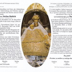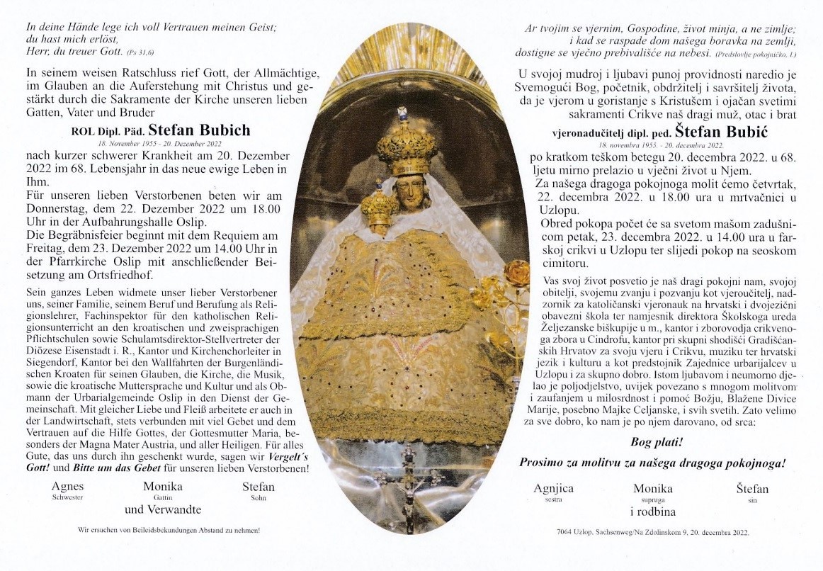 ROL Dipl.Päd. Stefan Bubich, langjähriger Fachinspektor für den kroatischen Religionsunterricht im Burgenland und stellvertretender Direktor des Schulamts der Diözese Eisenstadt, verstarb am 20.12. nach kurzer schwerer Krankheit im 68. Lebensjahr. Die Trauerfeier fand am 23.12. in seiner Heimatgemeinde Oslip statt.