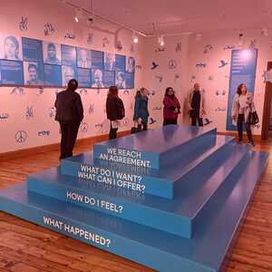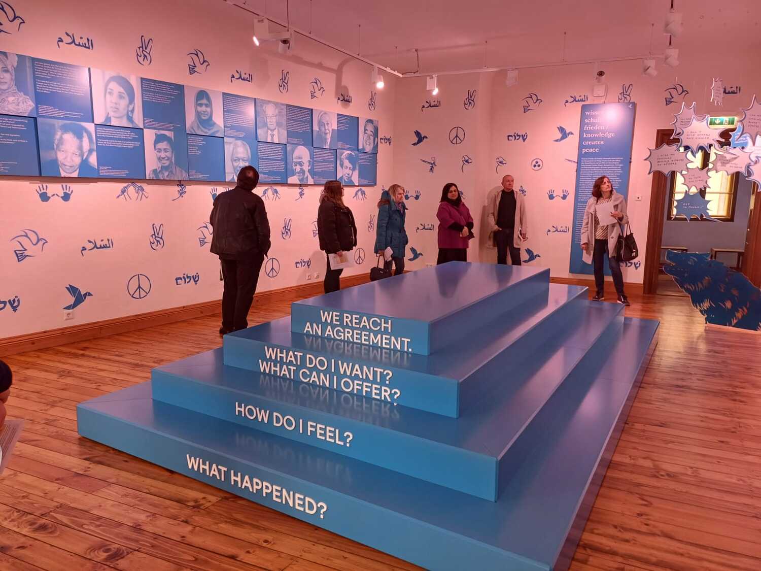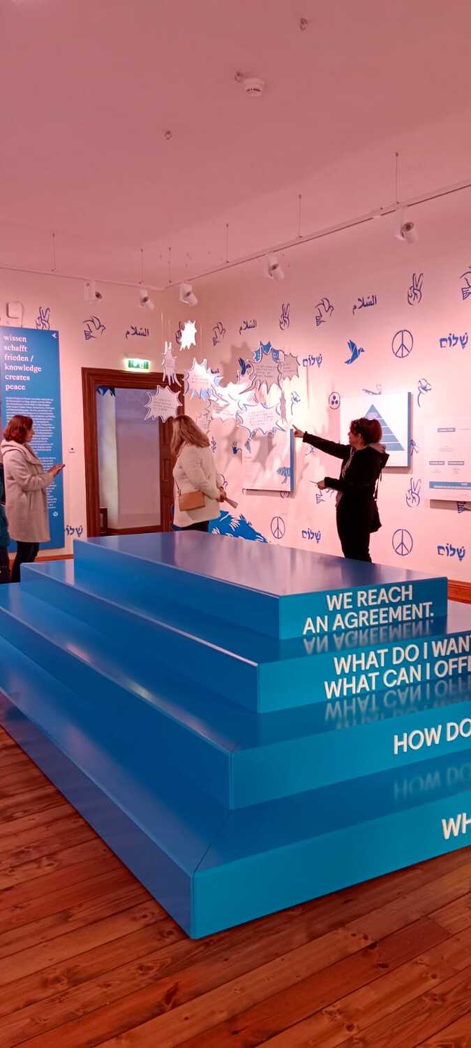 Die Führung durch die Ausstellung Schlaining und Frieden des Austrian Centre for Peace (ACP) bot einen interaktiven Einblick in dessen Entstehungsgeschichte, Arbeit und Methodik. Beginnend mit der Gründung in den 1980er-Jahren durch Gerald Mader wurde ein Bogen bis zu den aktuellen Konflikten unserer Zeit gespannt. Die Ausstellung ermöglichte uns eine Auseinandersetzung mit verschiedenen Aspekten von Frieden und Friedenskultur und die Bedeutung der Friedensarbeit in einer globalisierten Welt zu erkennen. Die Bedeutung des positiven Friedens wurde deutlich.
