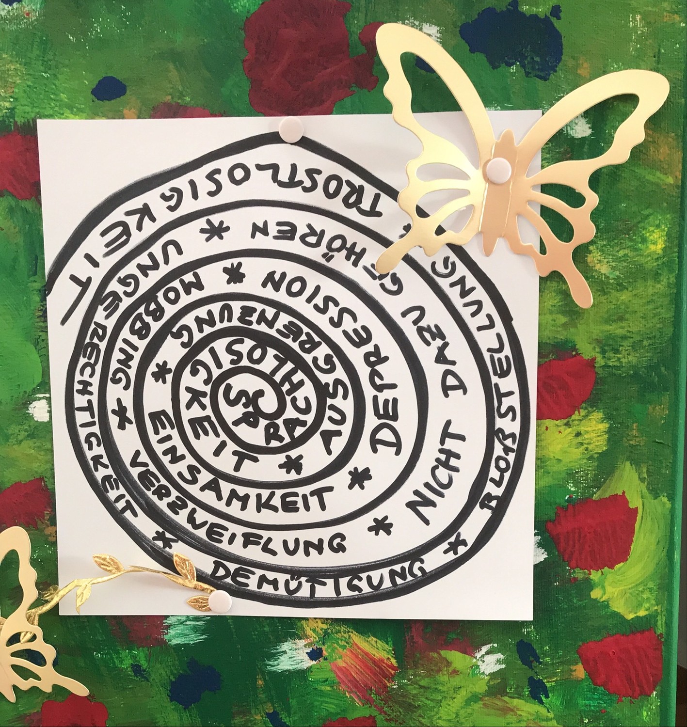 Die verschiedenen Interpretationen und Wahrnehmungen finden sich in Bildern und Worten auf einem großen Bild einer Blumenwiese wieder und werden durch einen goldenen Blütenfaden verbunden – goldene Schmetterlinge sind Zeichen für die Hoffnung auf WANDEL.