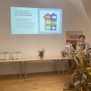 „Schritt für Schritt zu mehr Nachhaltigkeit“ geht die Pfarre Kaisersdorf seit einigen Jahren. Auch in dieser Pfarre spielt Nachhaltigkeit in den verschiedenen pastoralen und wirtschaftlichen Bereichen eine bedeutende Rolle. So wurden alle Leuchtmittel auf LED umgestellt, Pfarrwiesen werden für den Anbau von Bio-Heu verpachtet, Kirchenschmuck wird wiederverwendet, die Zeltlager der Ministranten haben jedes einen Schöpfungsschwerpunkt und auch bei Festen steht der Gedanke „Mehrweg statt Einweg“ im Fokus. Ein besonderes Anliegen sind der Kuratorin Ingeborg Brandl der Schutz der Fledermäuse im Glockenturm, deren Population sich in den letzten Jahren um einiges vergrößert hat.