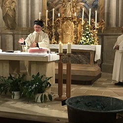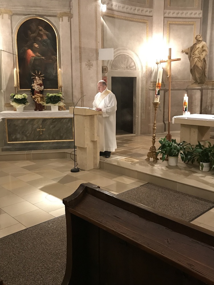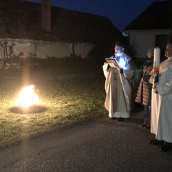 Nach der Lichtfeier, der Segnung des Osterfeuers, im Pfarrhofgarten zogen wir in die Stadtpfarrkirche, wo die Messfeier, beginnend mit dem großen Exsultet (Osterlob) fortgesetzt wurde.