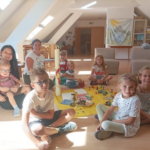 Kinder im Alter von 2-9 Jahren und deren Eltern oder Großeltern sind im Pfarrheim am Oberberg zusammengekommen um zu beten, zu singen und eine Erzählung über Jesus aus der Bibel zu hören.