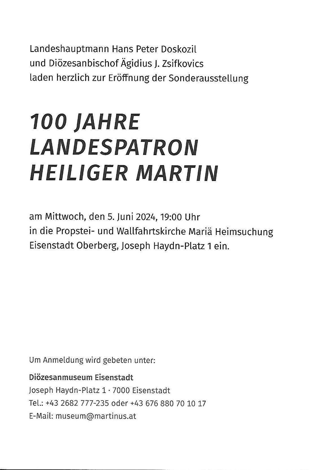100 Jahre Landespatron heiliger Martin: Landeshauptmann Hans Peter Doskozil und Diözesanbischof Ägidius J. Zsifkovics laden herzlich zur Eröffnung der Sonderausstellung am Mittwoch, dem 5. Juni 2024, 19 Uhr, in die Propstei- und Wallfahrtskirche Mariä Heimsuchung Eisenstadt Oberberg ein.