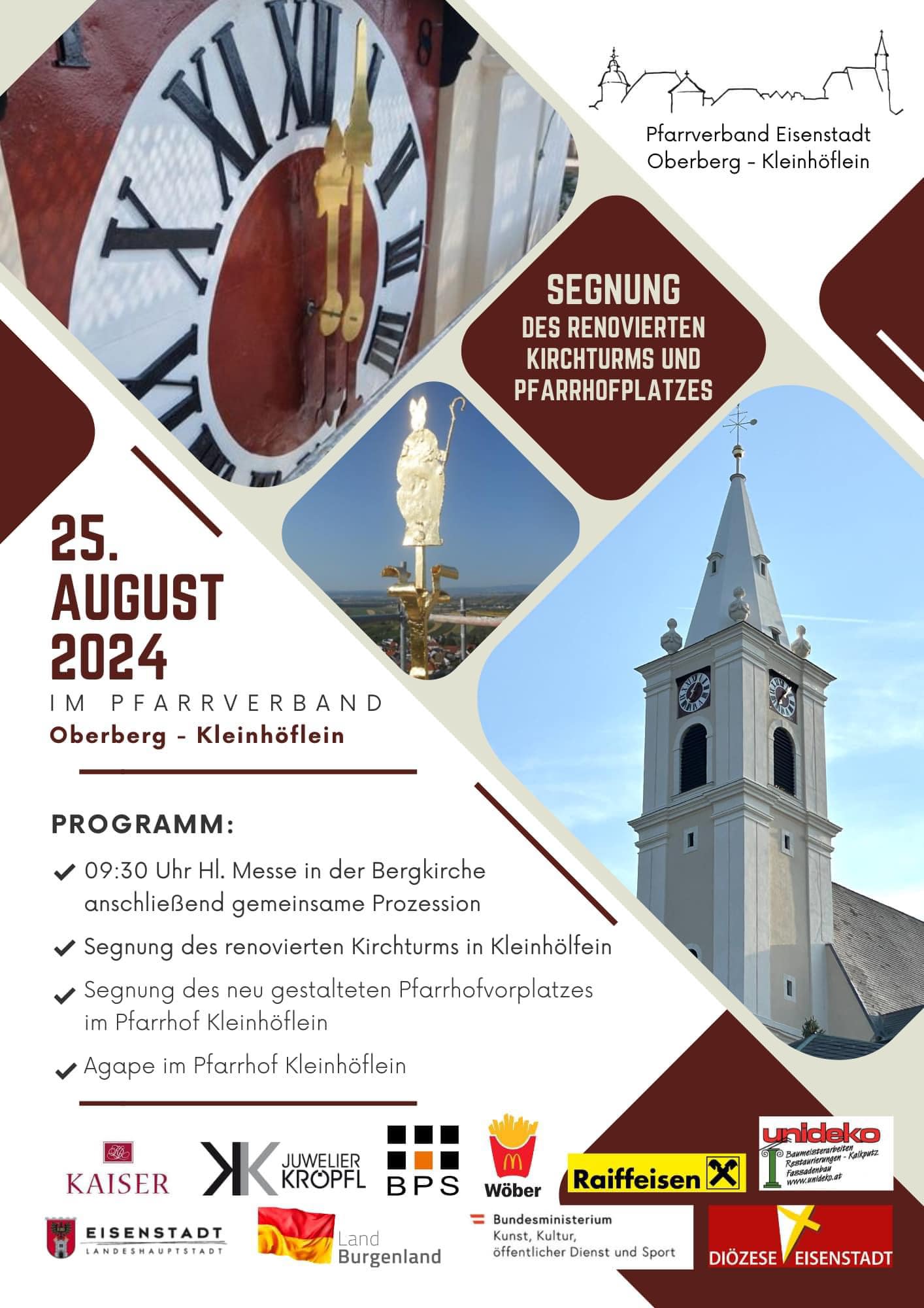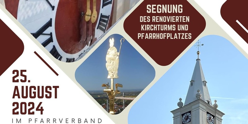 EINLADUNG: Beim letzten Gottesdienst am 25. August 2024, den DDr. Alexander Wessely als Pfarrer des Pfarrverbandes Eisenstadt Oberberg-Kleinhöflein feiern wird, wird der renovierte Kirchturm in Kleinhöflein und der neu gestaltete Pfarrhofplatz im Pfarrhof Kleinhöflein gesegnet.