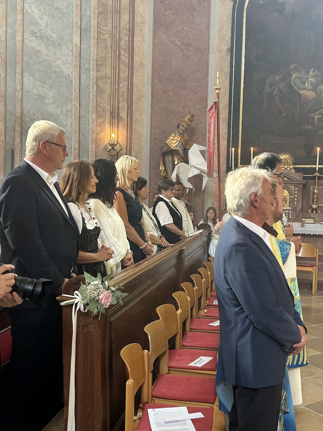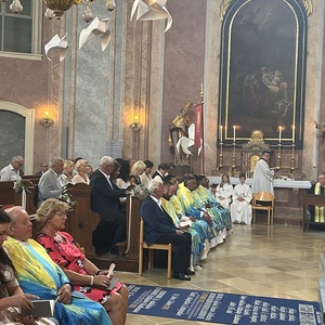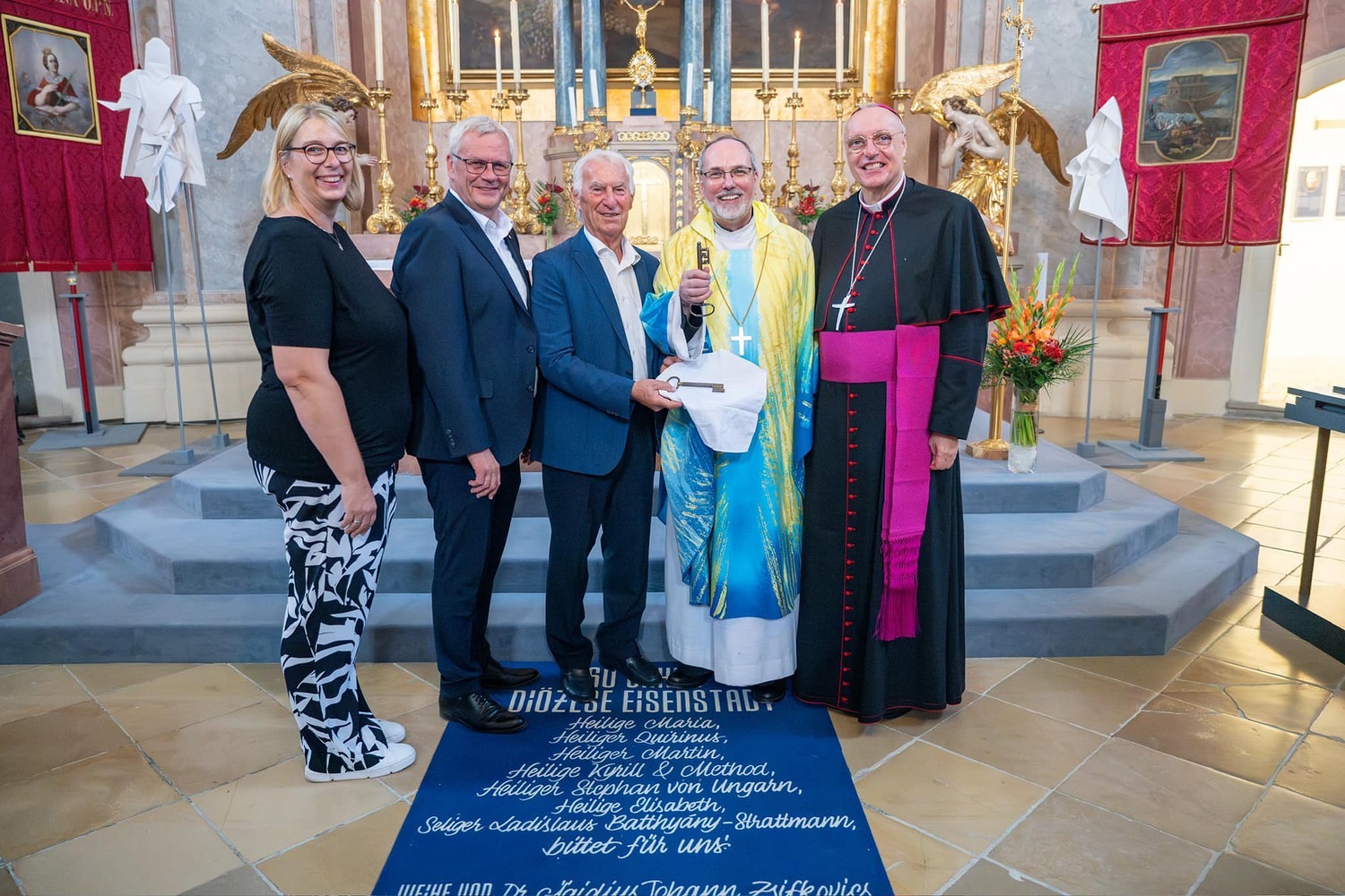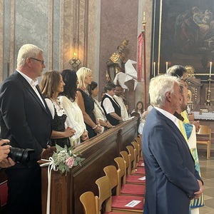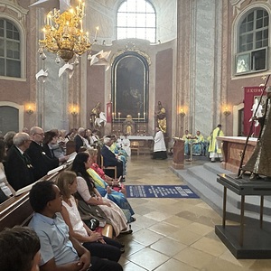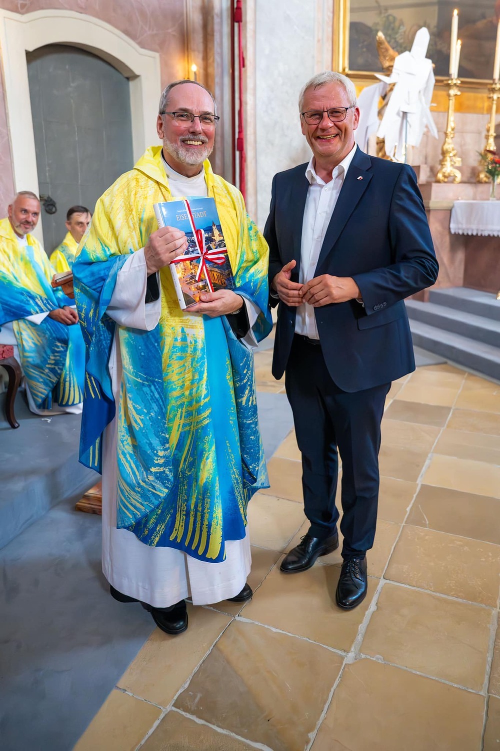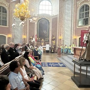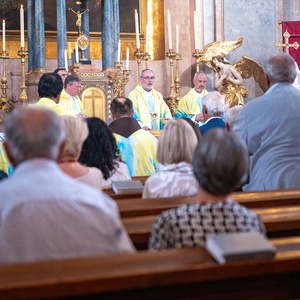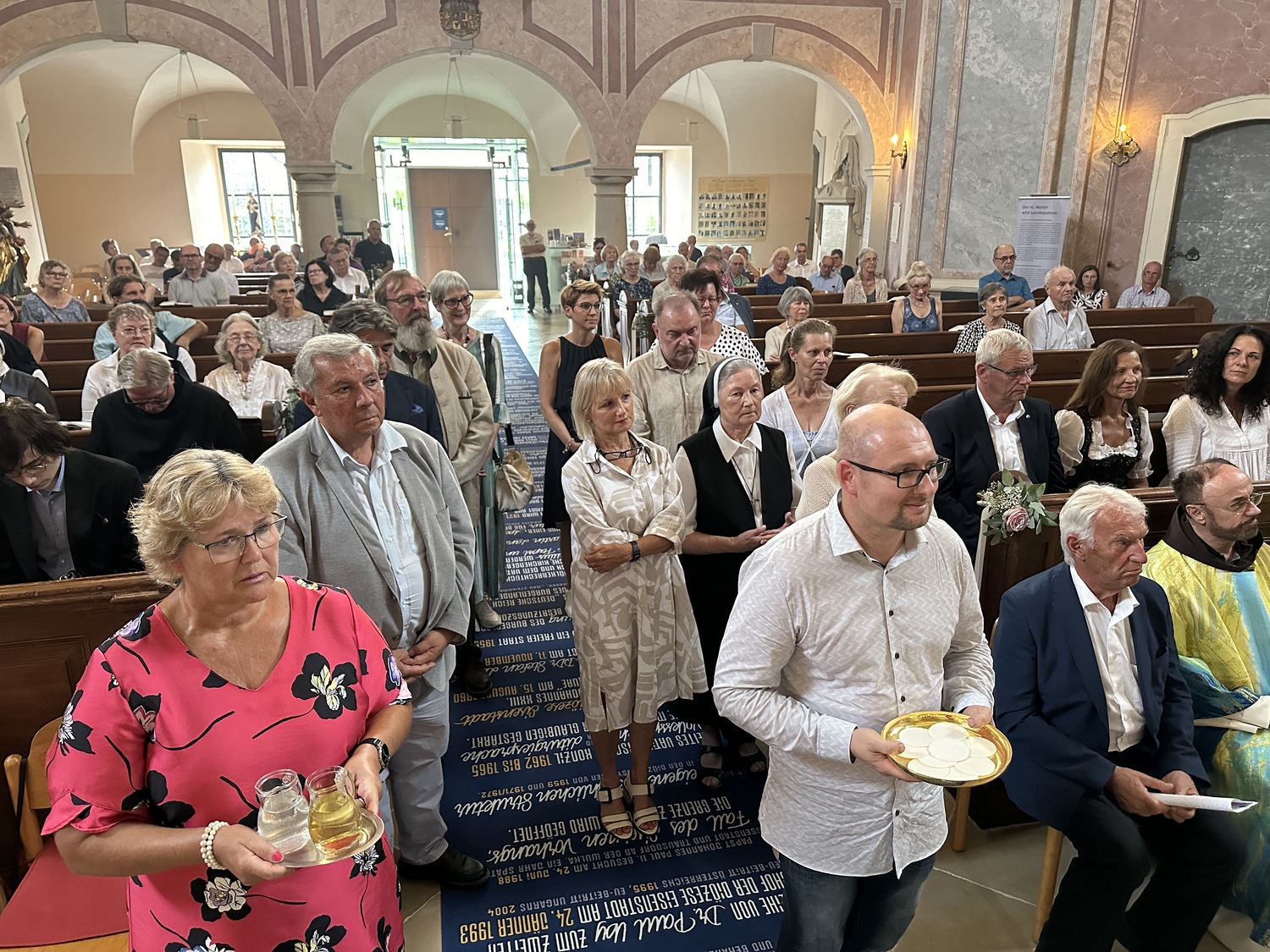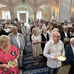 Hauptamtliche Mitarbeiter, sowie die Pfarrgemeinderäte der beiden Pfarren - angeführt durch die beiden Kuratoren Hans Skarits und Kerstin Kosky - übergaben symbolisch die Kirchenschlüssel und brachten Wein und Brot zur Feier der Eucharistie. Zahlreiche Ordensfrauen und -Männer, Priester, der Regens des Wiener Priesterseminars, Redemptoristenpatres, Vertreter der Stadt (Bürgermeister, Vizebürgermeisterin und Amtsleiterin), Mitglieder des "Lazarus-Orden", sowie viele Mitarbeiterinnen und Mitarbeiter der Pfarren waren bei der Feier anwesend; der Chor der Haydnkirche gestaltete musikalisch den Gottesdienst; anschl. wurde von der Pfarre Oberberg zur Agape eingeladen.