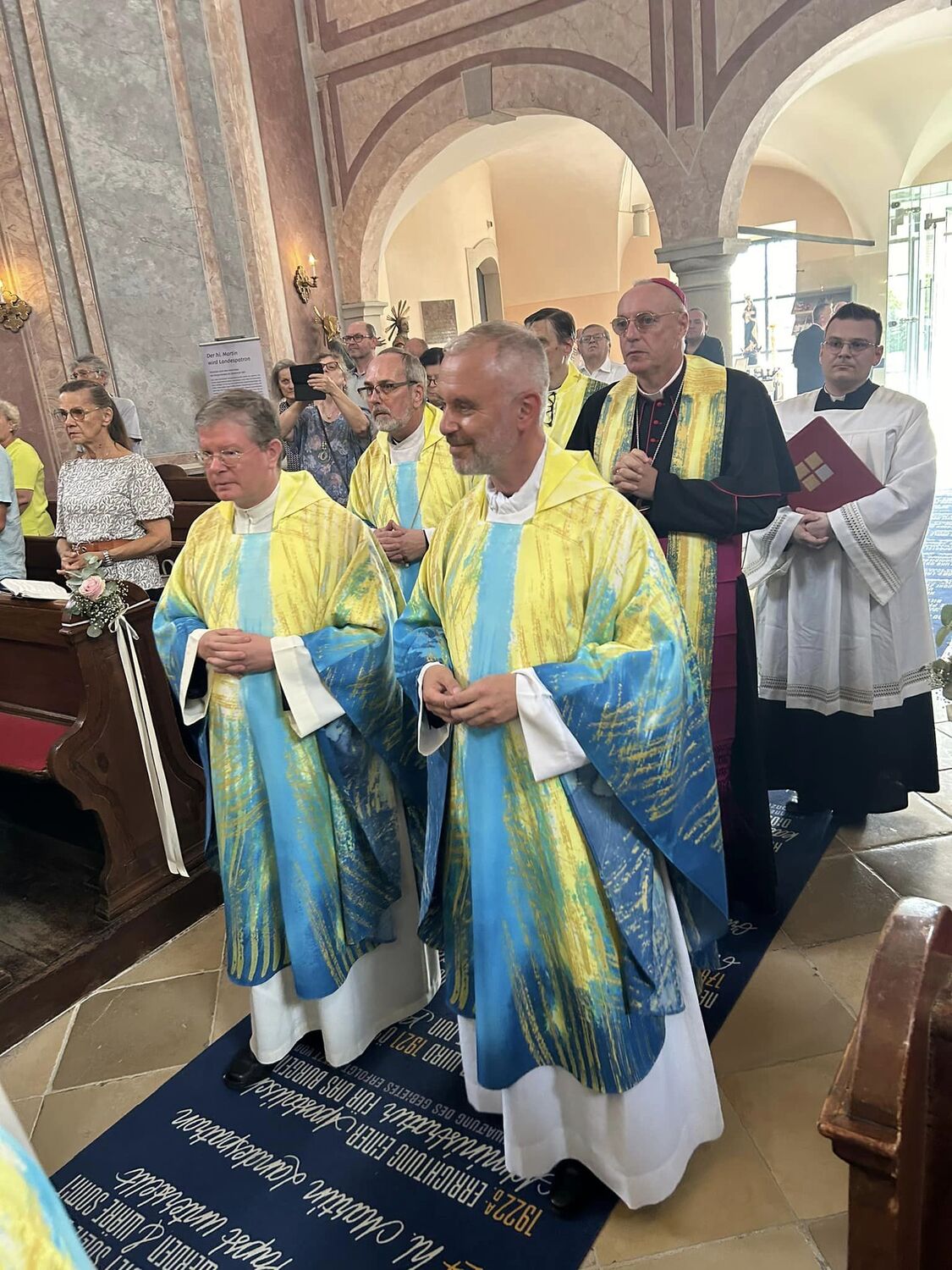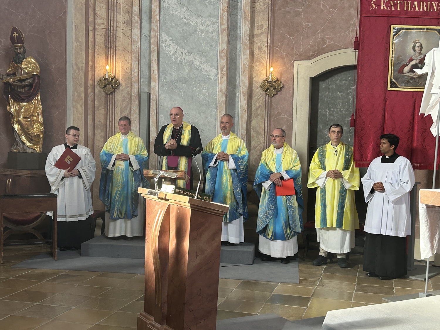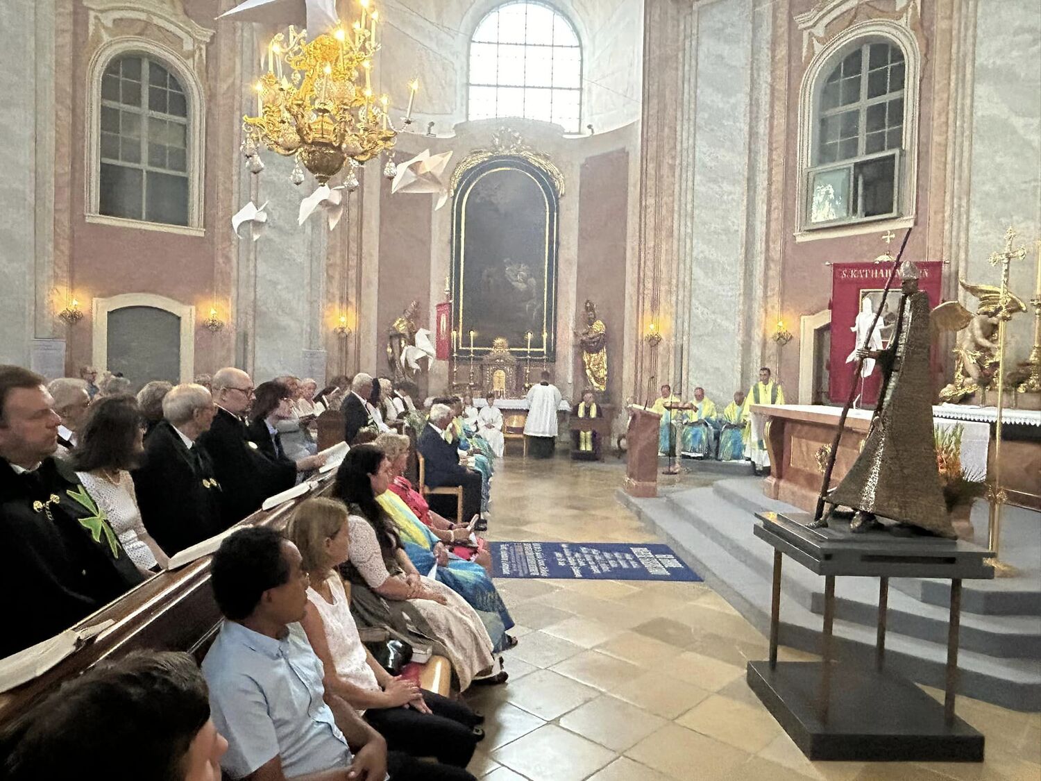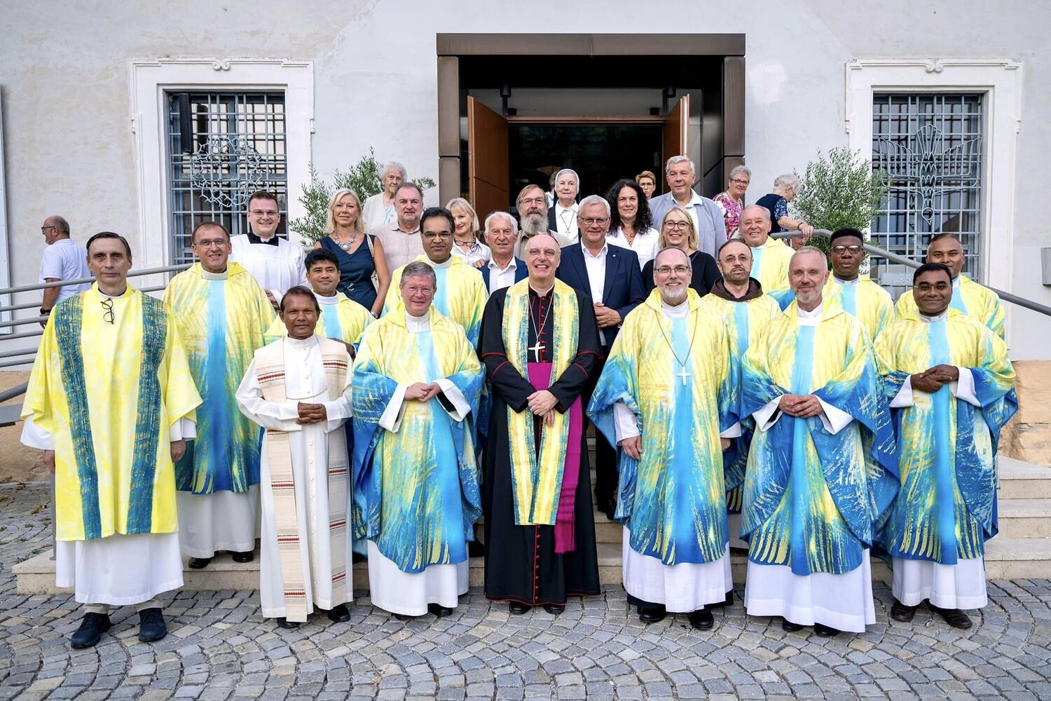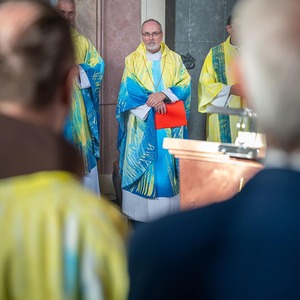 Hauptamtliche Mitarbeiter, sowie die Pfarrgemeinderäte der beiden Pfarren - angeführt durch die beiden Kuratoren Hans Skarits und Kerstin Kosky - übergaben symbolisch die Kirchenschlüssel und brachten Wein und Brot zur Feier der Eucharistie. Zahlreiche Ordensfrauen und -Männer, Priester, der Regens des Wiener Priesterseminars, Redemptoristenpatres, Vertreter der Stadt (Bürgermeister, Vizebürgermeisterin und Amtsleiterin), Mitglieder des "Lazarus-Orden", sowie viele Mitarbeiterinnen und Mitarbeiter der Pfarren waren bei der Feier anwesend; der Chor der Haydnkirche gestaltete musikalisch den Gottesdienst; anschl. wurde von der Pfarre Oberberg zur Agape eingeladen.