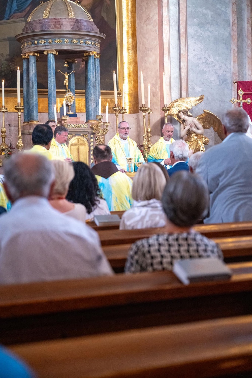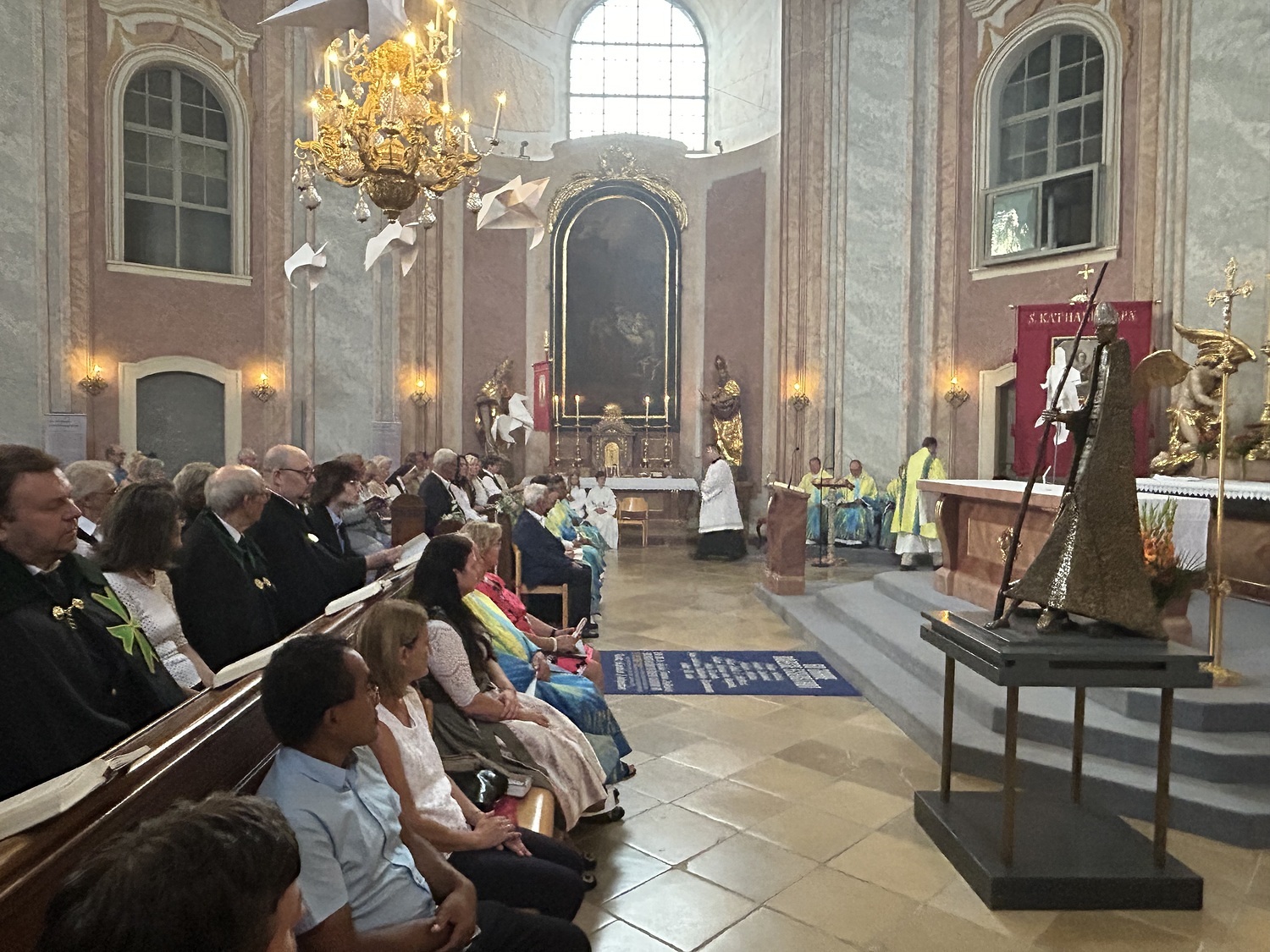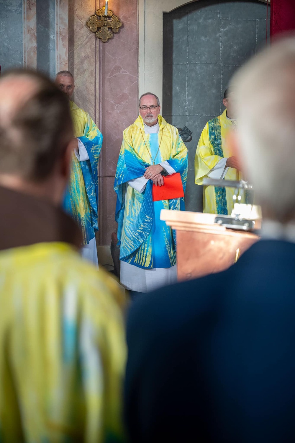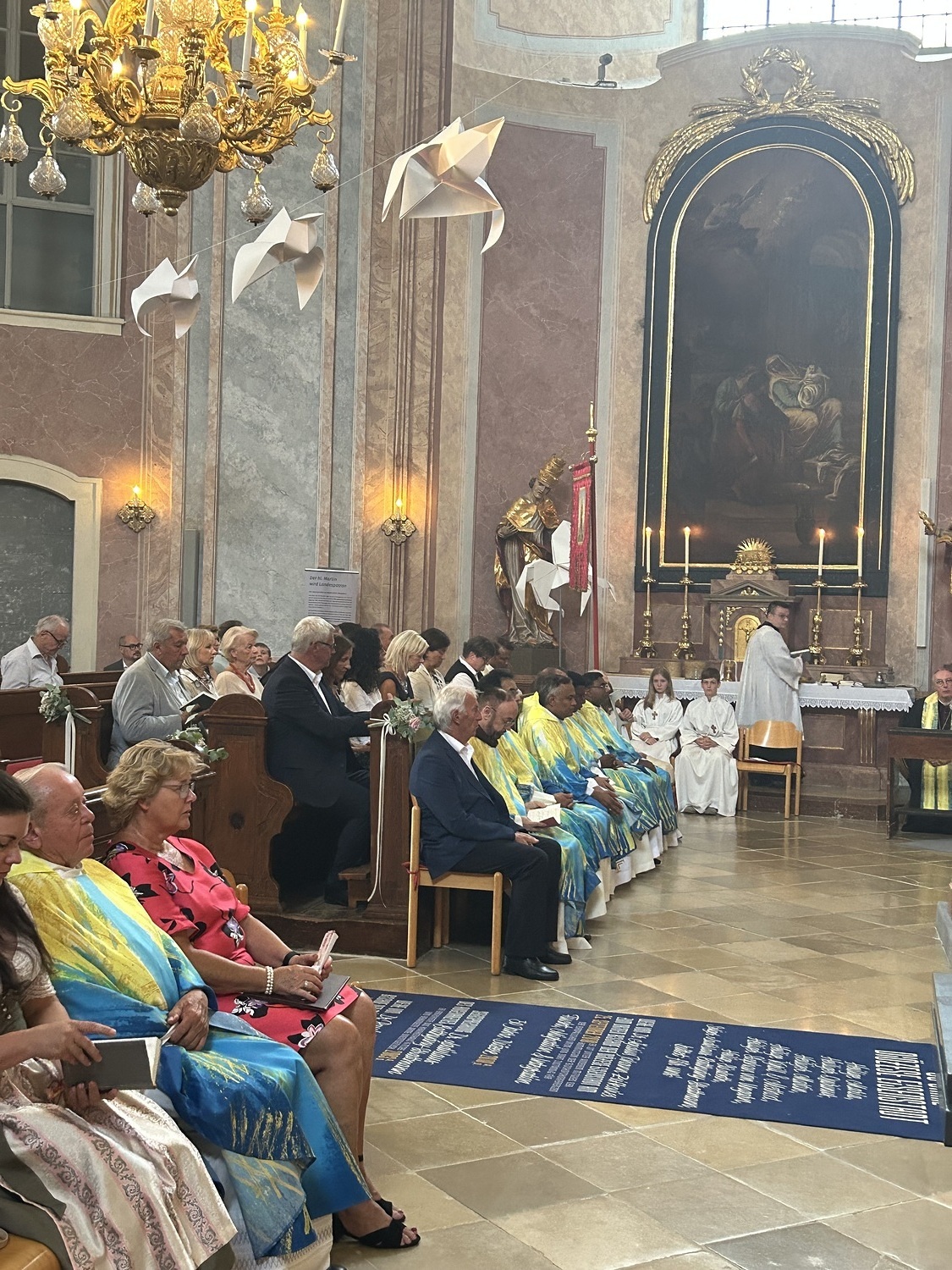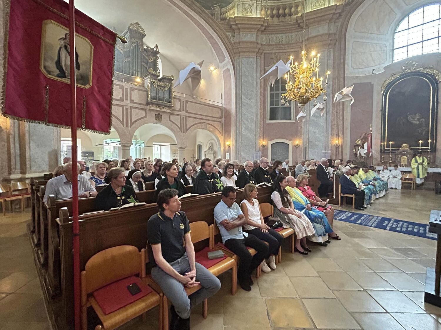 Hauptamtliche Mitarbeiter, sowie die Pfarrgemeinderäte der beiden Pfarren - angeführt durch die beiden Kuratoren Hans Skarits und Kerstin Kosky - übergaben symbolisch die Kirchenschlüssel und brachten Wein und Brot zur Feier der Eucharistie. Zahlreiche Ordensfrauen und -Männer, Priester, der Regens des Wiener Priesterseminars, Redemptoristenpatres, Vertreter der Stadt (Bürgermeister, Vizebürgermeisterin und Amtsleiterin), Mitglieder des "Lazarus-Orden", sowie viele Mitarbeiterinnen und Mitarbeiter der Pfarren waren bei der Feier anwesend; der Chor der Haydnkirche gestaltete musikalisch den Gottesdienst; anschl. wurde von der Pfarre Oberberg zur Agape eingeladen.