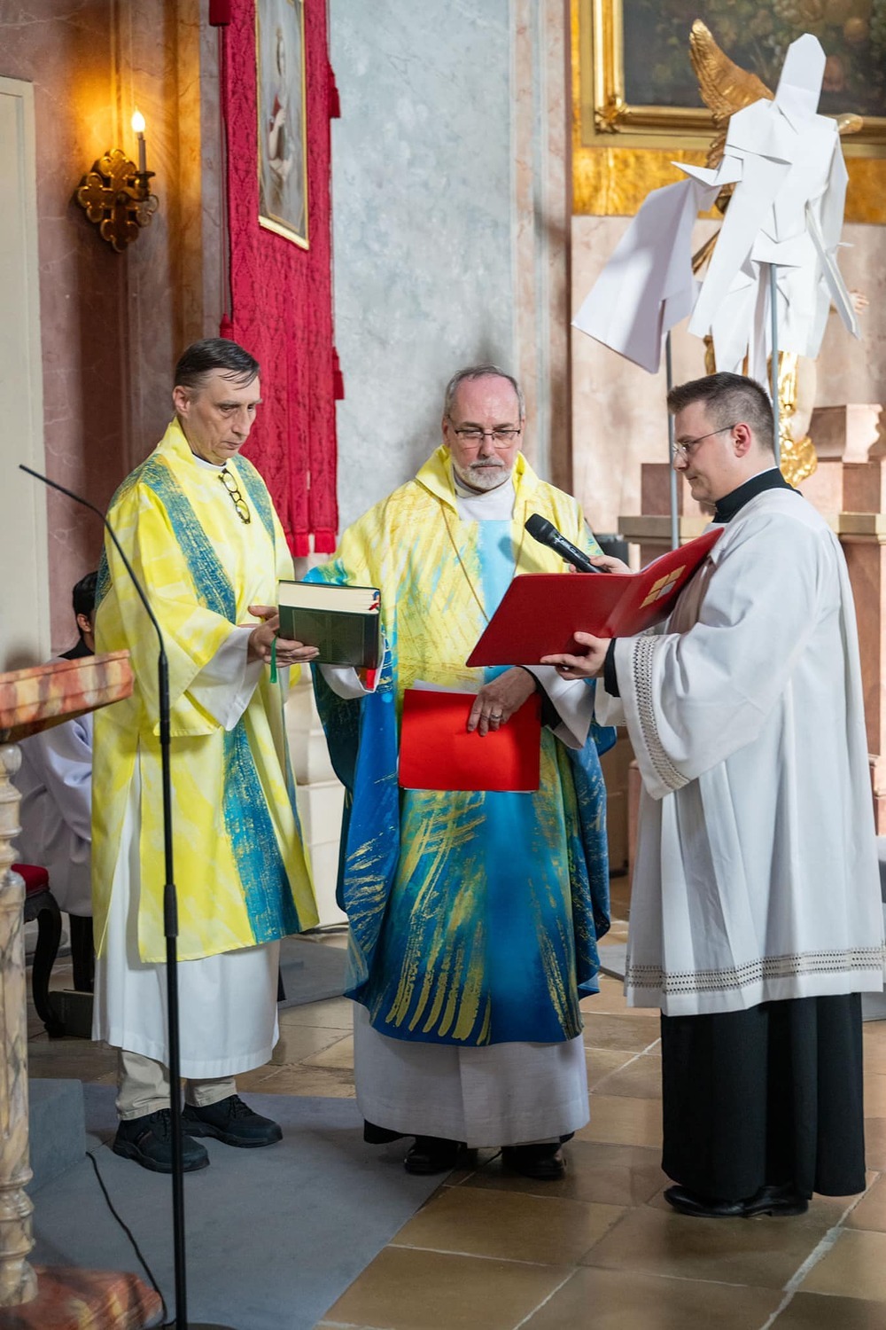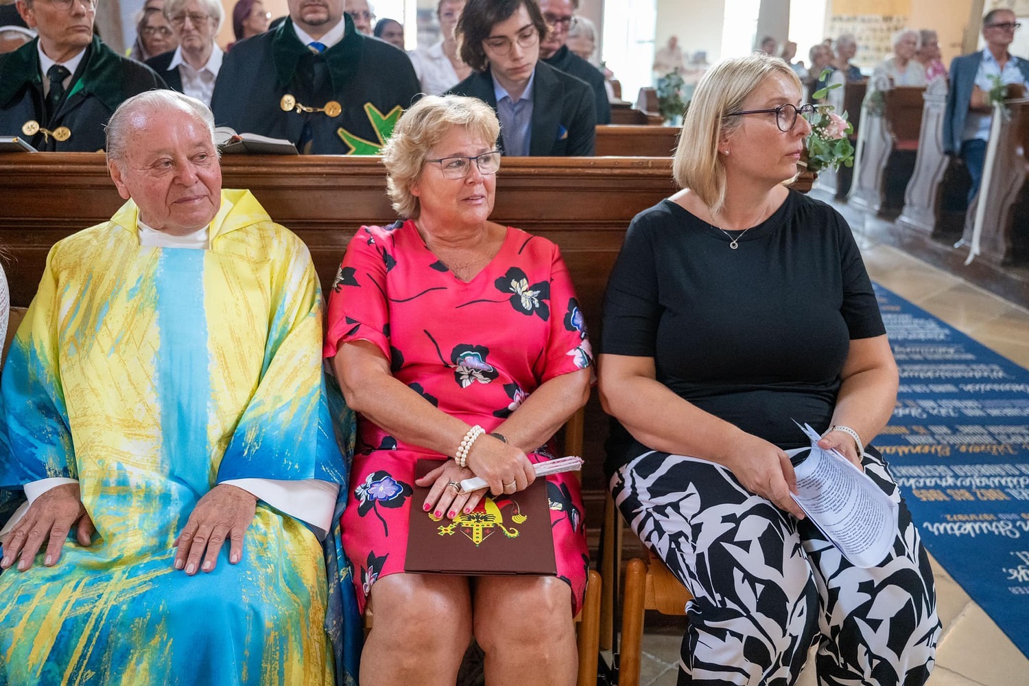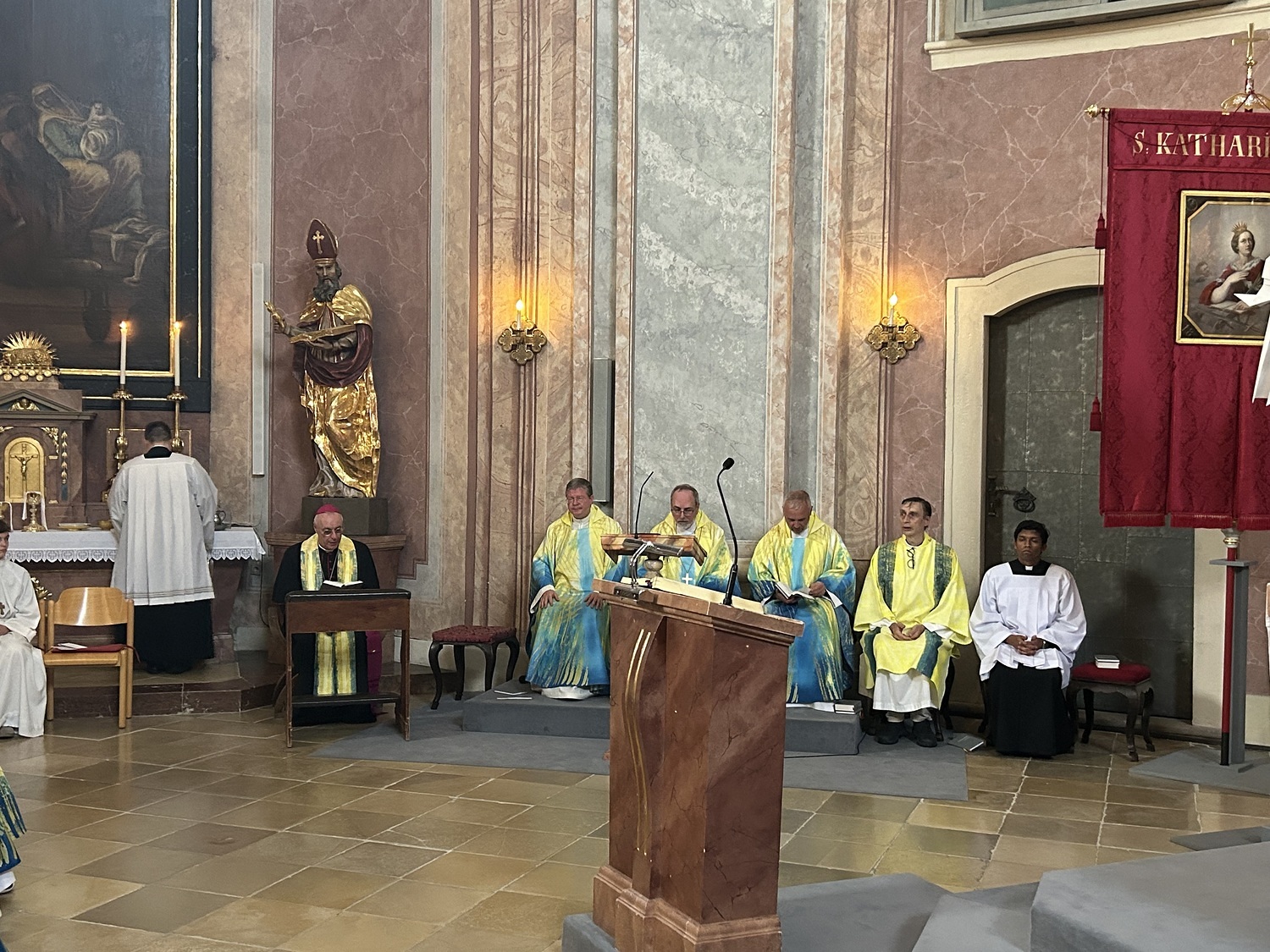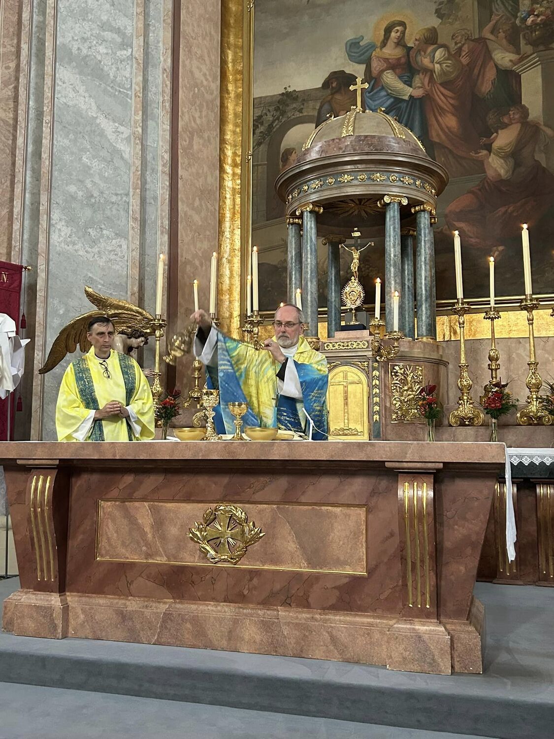 Hauptamtliche Mitarbeiter, sowie die Pfarrgemeinderäte der beiden Pfarren - angeführt durch die beiden Kuratoren Hans Skarits und Kerstin Kosky - übergaben symbolisch die Kirchenschlüssel und brachten Wein und Brot zur Feier der Eucharistie. Zahlreiche Ordensfrauen und -Männer, Priester, der Regens des Wiener Priesterseminars, Redemptoristenpatres, Vertreter der Stadt (Bürgermeister, Vizebürgermeisterin und Amtsleiterin), Mitglieder des "Lazarus-Orden", sowie viele Mitarbeiterinnen und Mitarbeiter der Pfarren waren bei der Feier anwesend; der Chor der Haydnkirche gestaltete musikalisch den Gottesdienst; anschl. wurde von der Pfarre Oberberg zur Agape eingeladen.