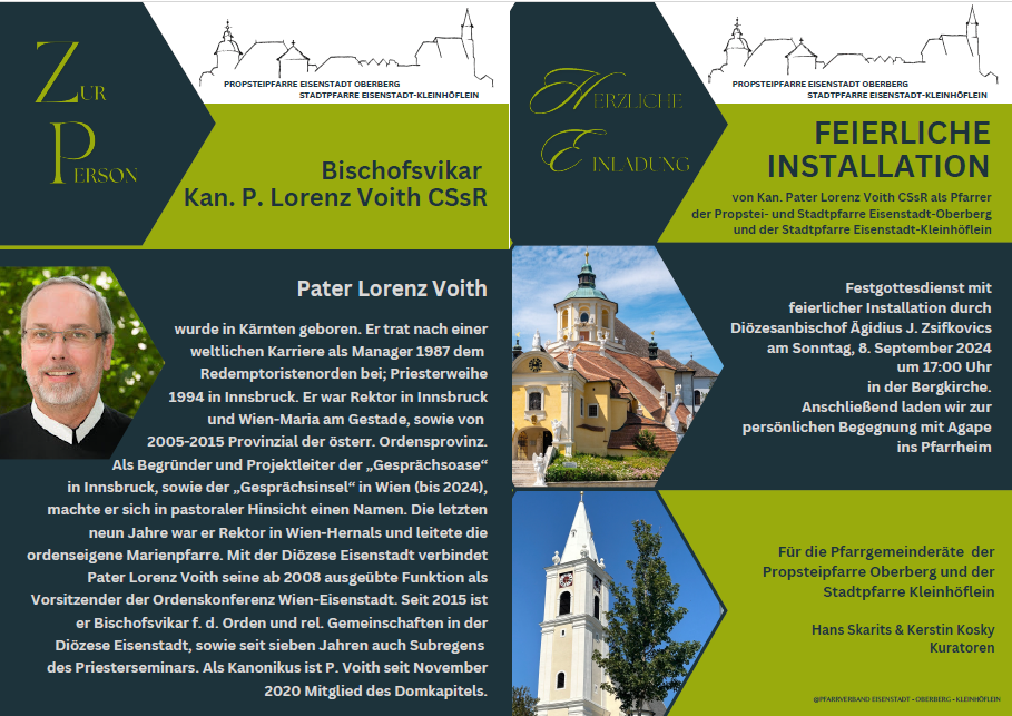 Die Amtseinführung und Installation zum Propstpfarrer von Oberberg und Stadtpfarrer von Kleinhöflein wurde am 8. September durch Diözesanbischof Ägidius Zsifkovics vollzogen. Der Bischof übergab dem neuen Pfarrer einen Pilgerstab zum Zeichen der Begleitung der ihm anvertrauten Gemeinden; er dankte P. Voith, dass er neben seinen anderen Funktionen in der Diözese, auch diese wichtige Aufgabe übernommen hat.