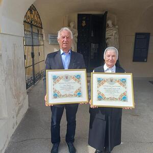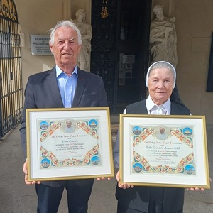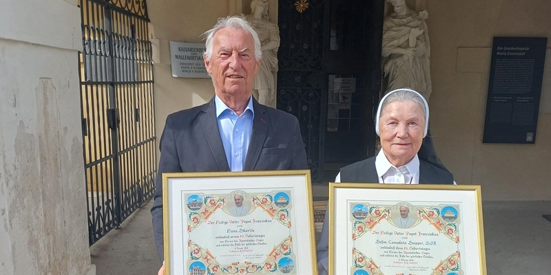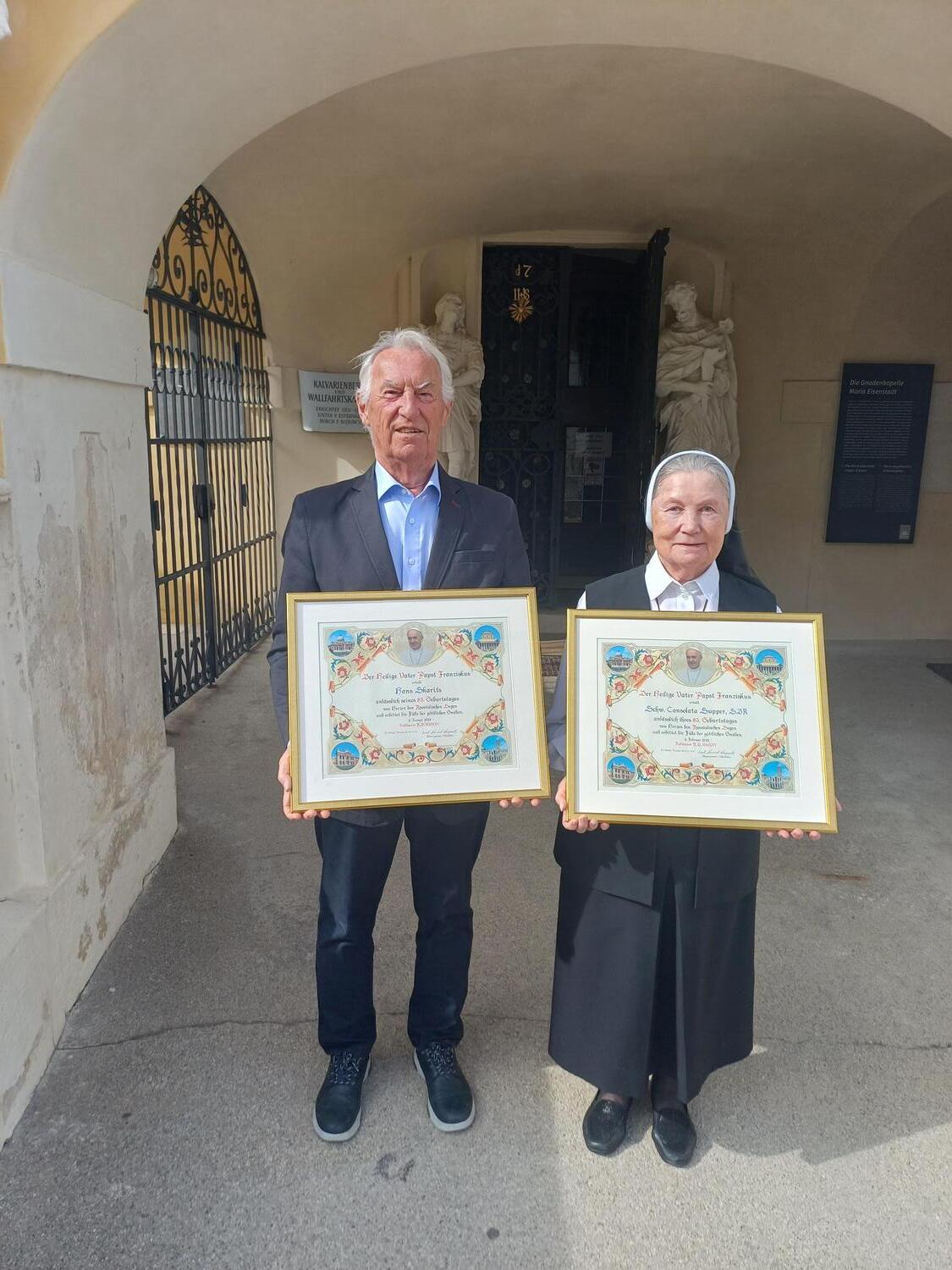 Propstpfarrer P. Lorenz Voith überreichte Kurator Hans Skarits und Sr. Consolata Supper SDR eine päpstliche Segensurkunde. Beide Persönlichkeiten feiern ihren 85. Geburtstag und sind seit Jahrzehnten mit dem Oberberg (der Pfarre und dem Kalvarienberg) verbunden. In einer Feier des Pfarrgemeinderates vor wenigen Wochen wurde für die Tätigkeiten gedankt. Beide Geehrten haben den Oberberg wesentlich mitgeprägt und sind weiterhin im PGR und darüber hinaus aktiv. Danke und Vergelt’s Gott! Die päpstliche Segensurkunde ist ein Zeichen der besonderen Wertschätzung.