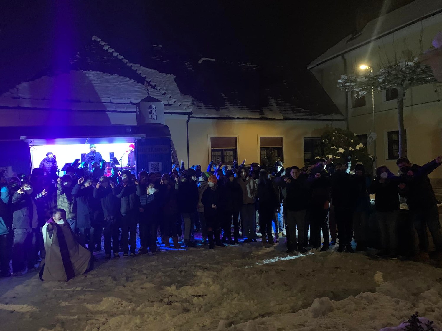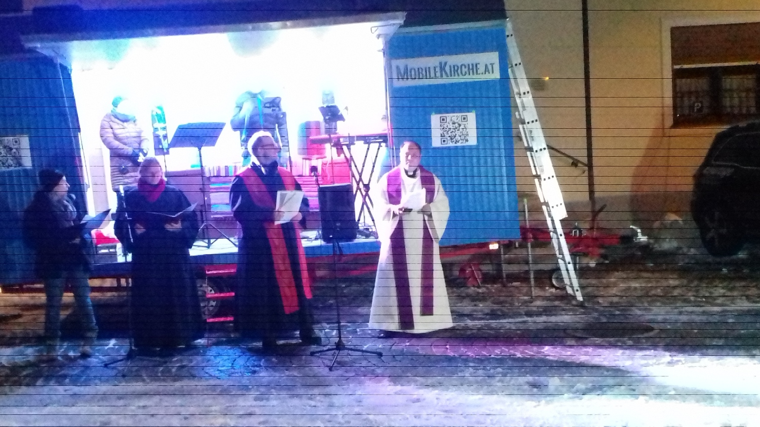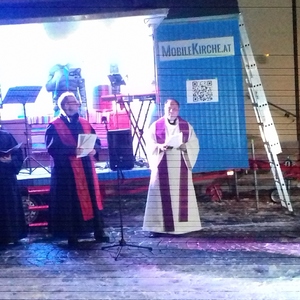 Der dritte Teil des Gottesdienstes wurde schließlich zusammen mit den Konfirmanten der Evangelischen Kirche vor der "Mobilen Kirche" der Evangelischen Jugend gefeiert.