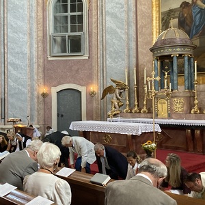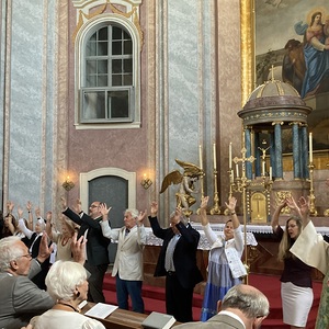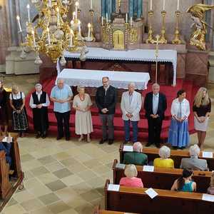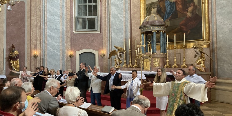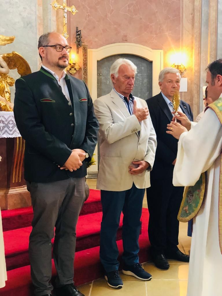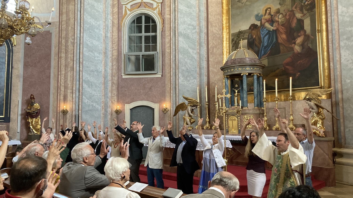 Den Mittelpunkt des Pfarrfestes am 26. Juni 2022 am Oberberg bildete der Gottesdienst, bei dem die Mitglieder von Pfarrgemeinderat und Wirtschaftsrat als Stärkung für die neue Amtsperiode von Pfarrer Alexander gesegnet wurden. Anschließend sangen alle gemeinsam "Gottes Liebe ist so wunderbar" und konnten sich mit den Bewegungen zu "So hoch – was kann höher sein? So tief – was kann tiefer sein? So weit – was kann weiter sein?" schon einmal für die nächste Pfarrgemeinderatssitzung aufwärmen.