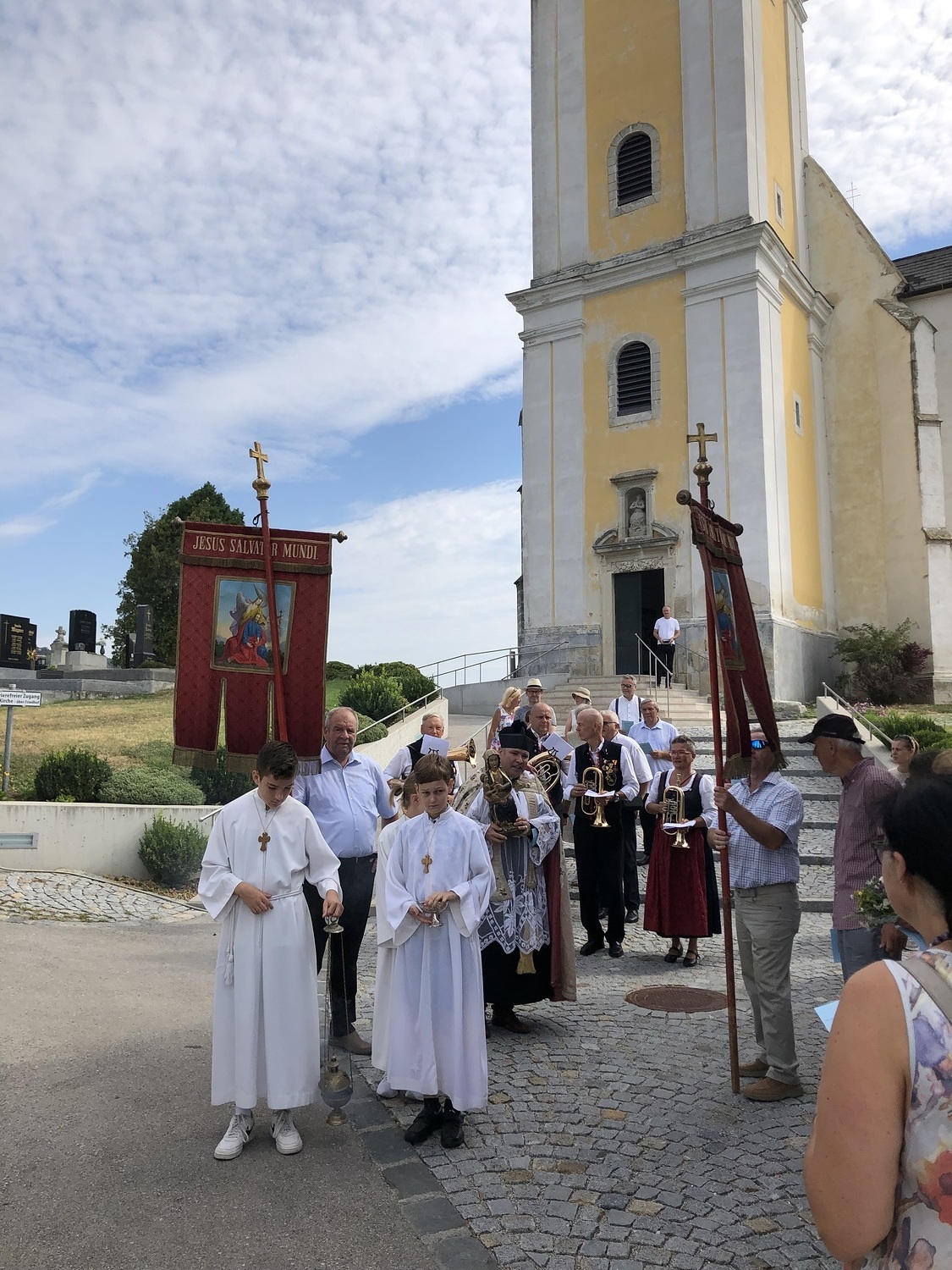 Bereits um 9:45 Uhr machte sich die Prozession mit Pilgern von der Pfarrkirche Kleinhöflein, begleitet von einem Bläserensemble und Sängern, auf den Weg zur Bergkirche.